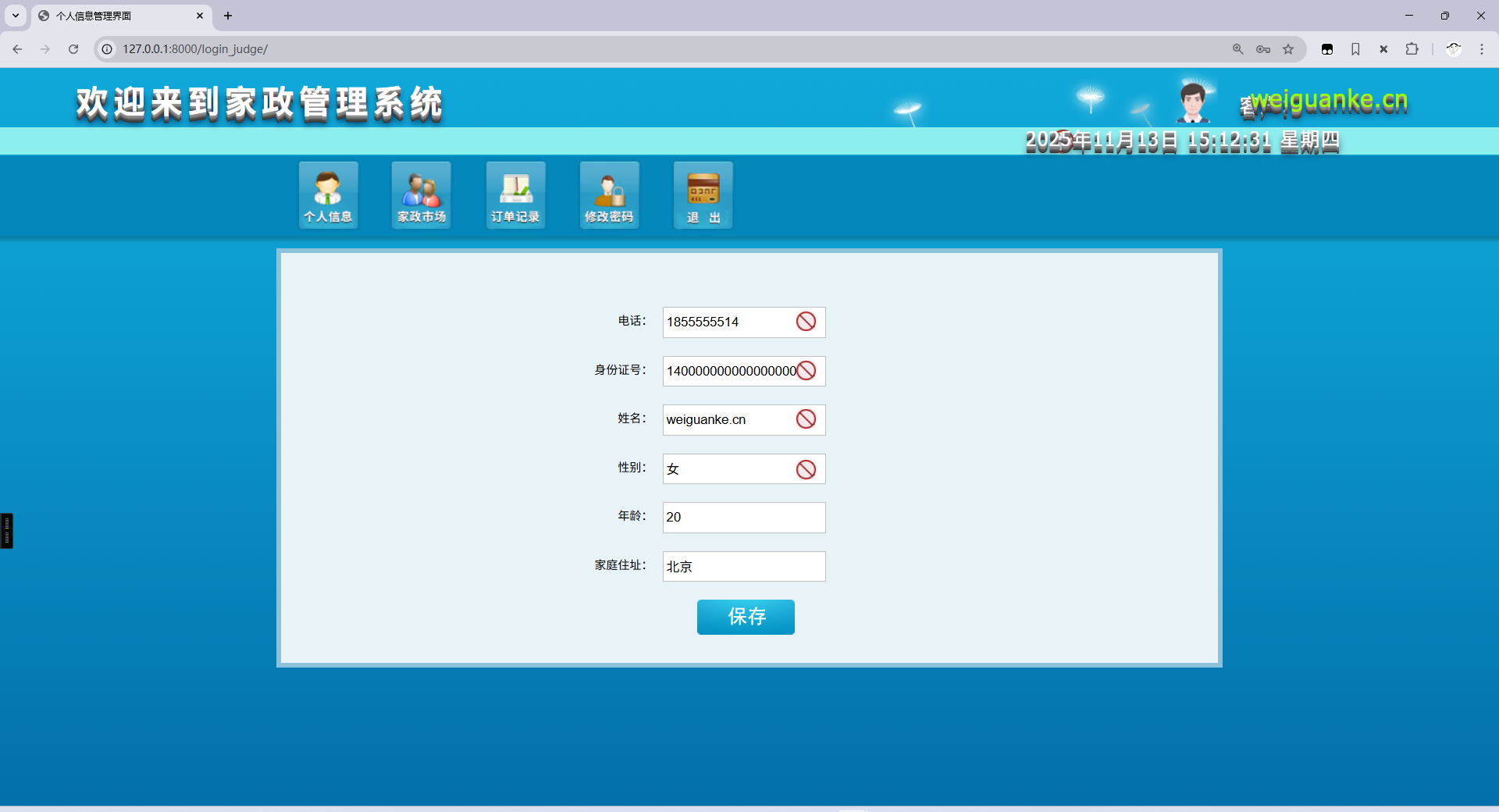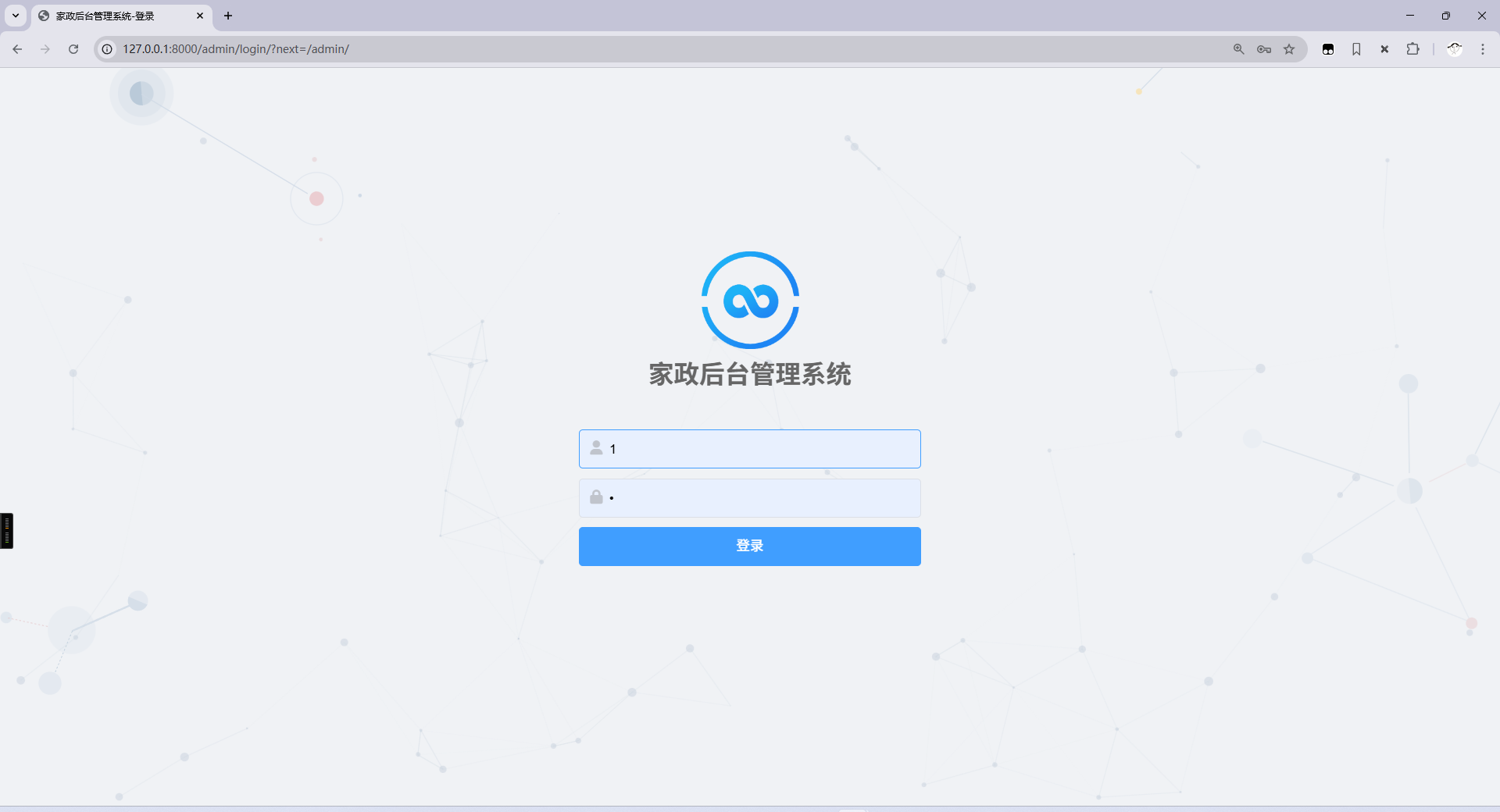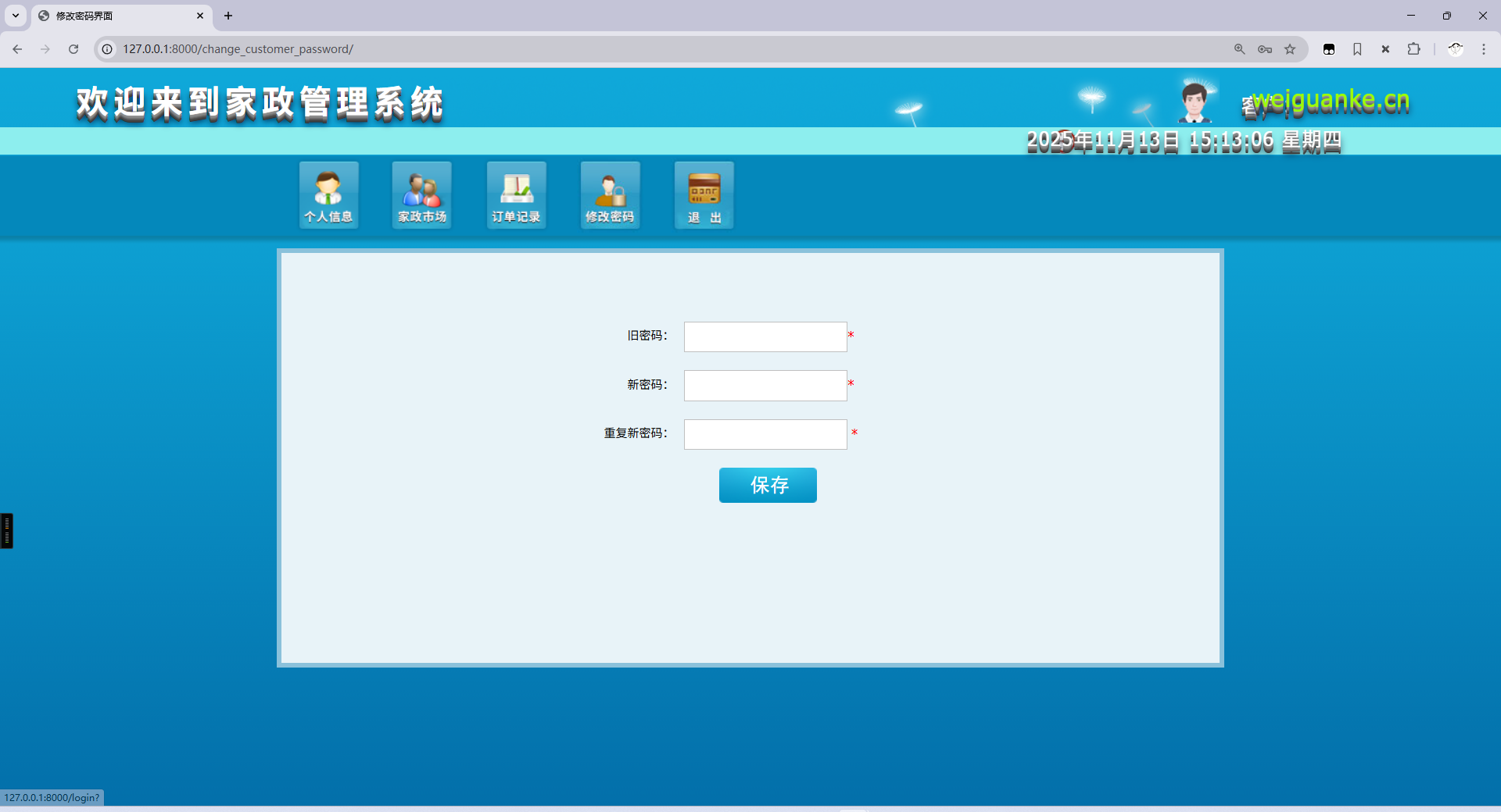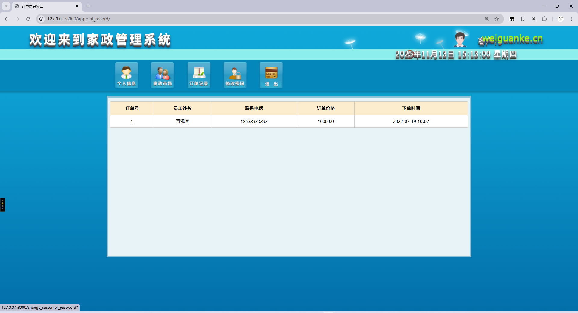 基于Django框架开发一个家政管理系统 一个有三个身份:家政员工,客户和管理员。 员工和客户都可以在前台注册登录,客户登陆后可以修改个人资料,查询家政市场的服务人员,查看自己预定的家政人员服务记录,修改密码和退出; 员工登陆后可以修改个人信息,查询自己的服务订单记录,查看公司给自己分配的财务记录,修改密码和退出; 管理员后台登陆后可以管理所有的信息
