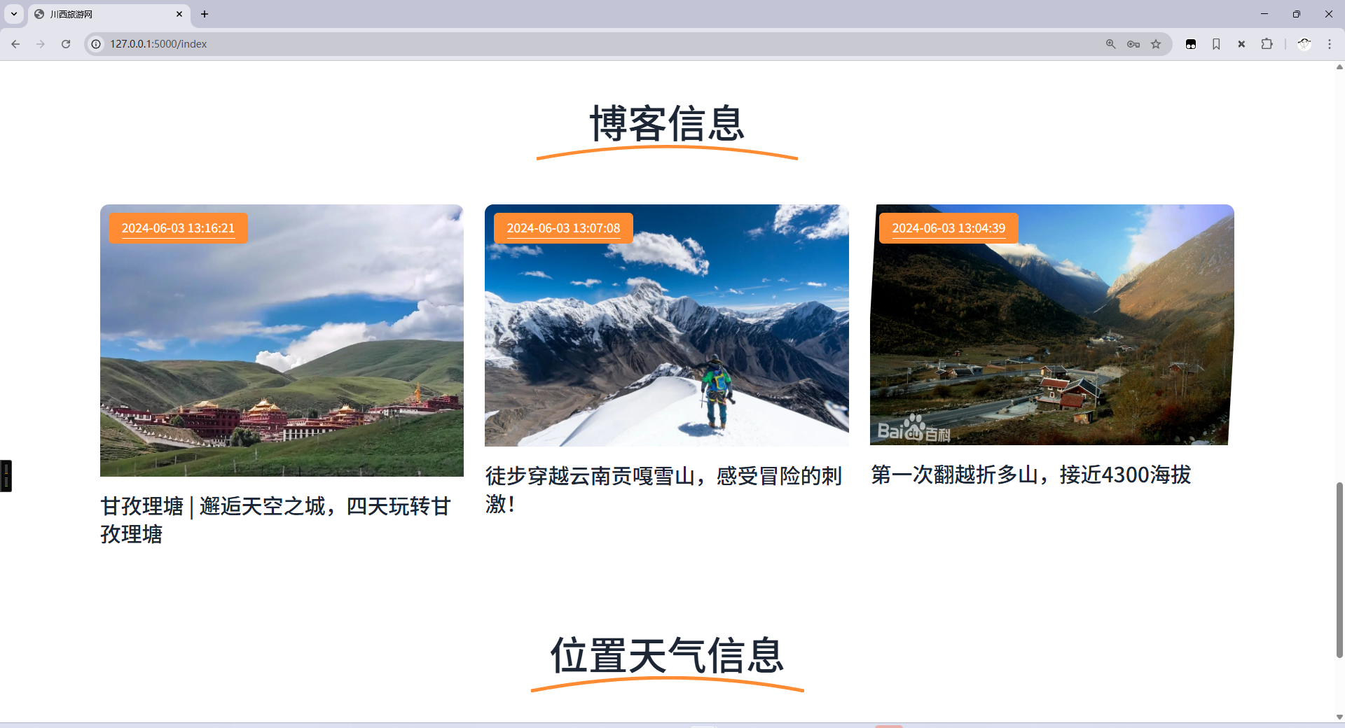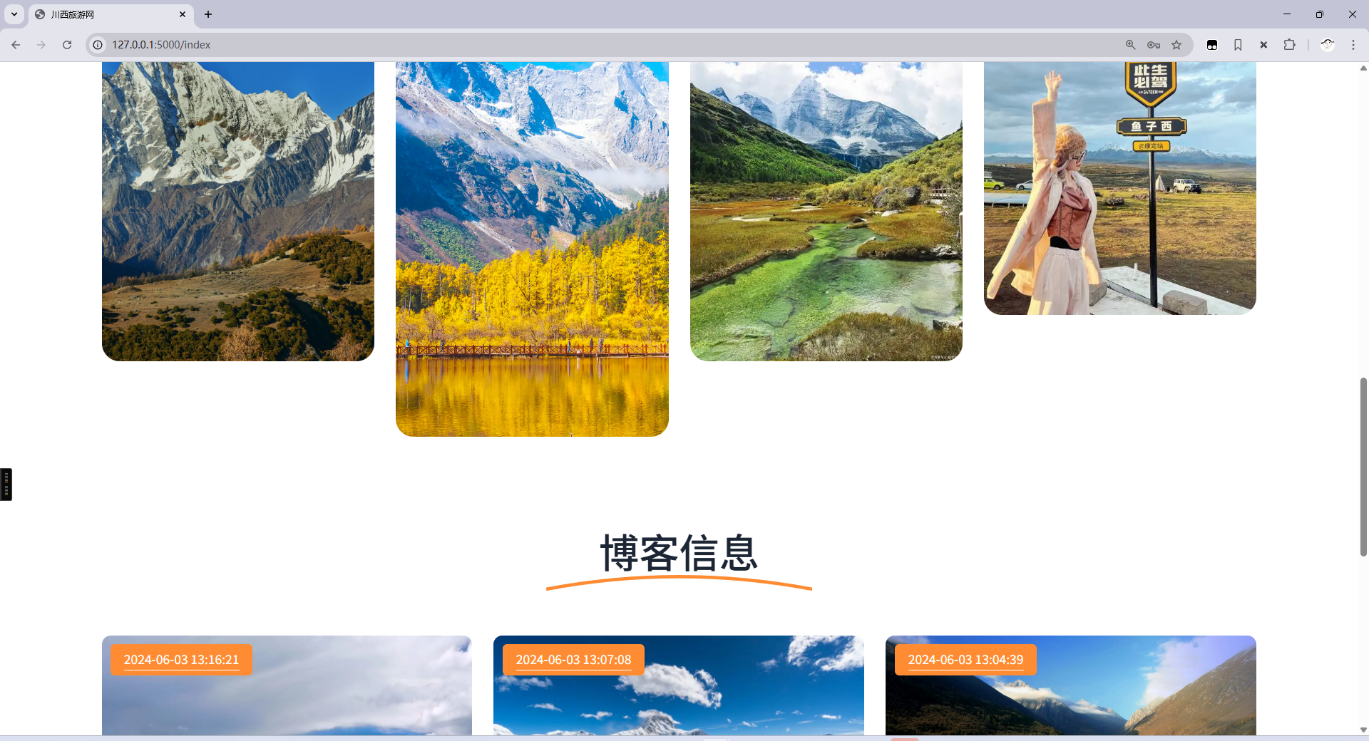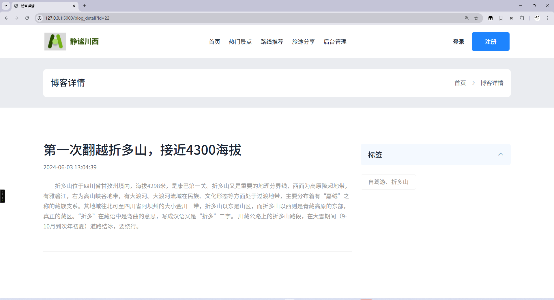 川西文旅网站是一个基于Python Flask框架开发的旅游博客平台,专注于展示川西地区的自然风光与人文特色。网站提供详细的景点介绍、推荐旅游路线及实用的旅行指南,涵盖交通、住宿和美食等信息。用户可注册账号、浏览内容、发表评论,管理员拥有后台管理权限。系统采用MySQL数据库,支持用户交互与内容管理,界面简洁友好,适合旅游爱好者获取灵感和规划行程。通过该平台,用户可以全面了解川西,提升旅行体验。