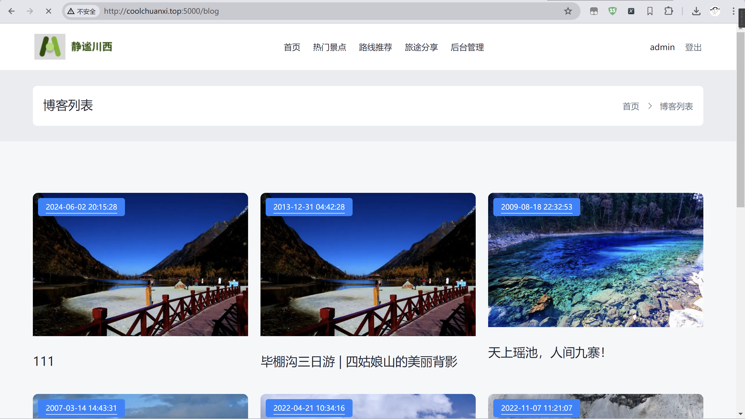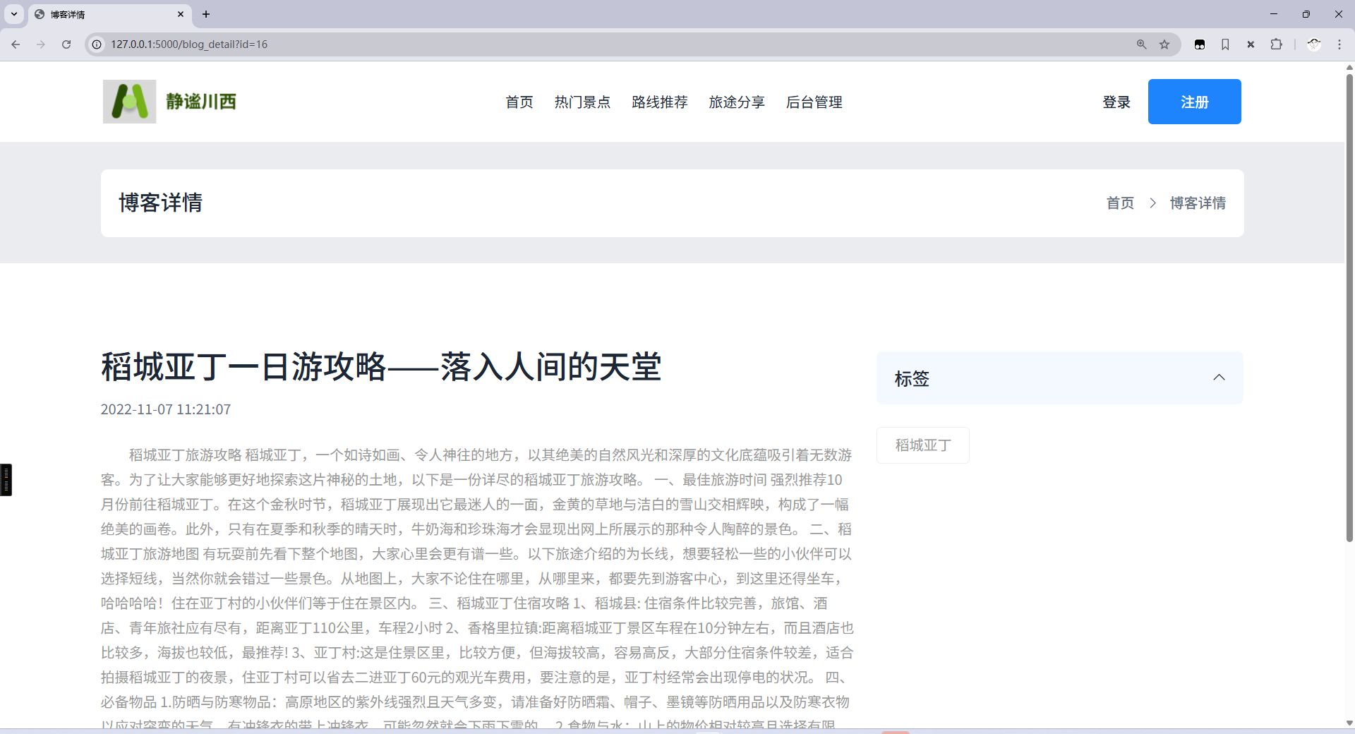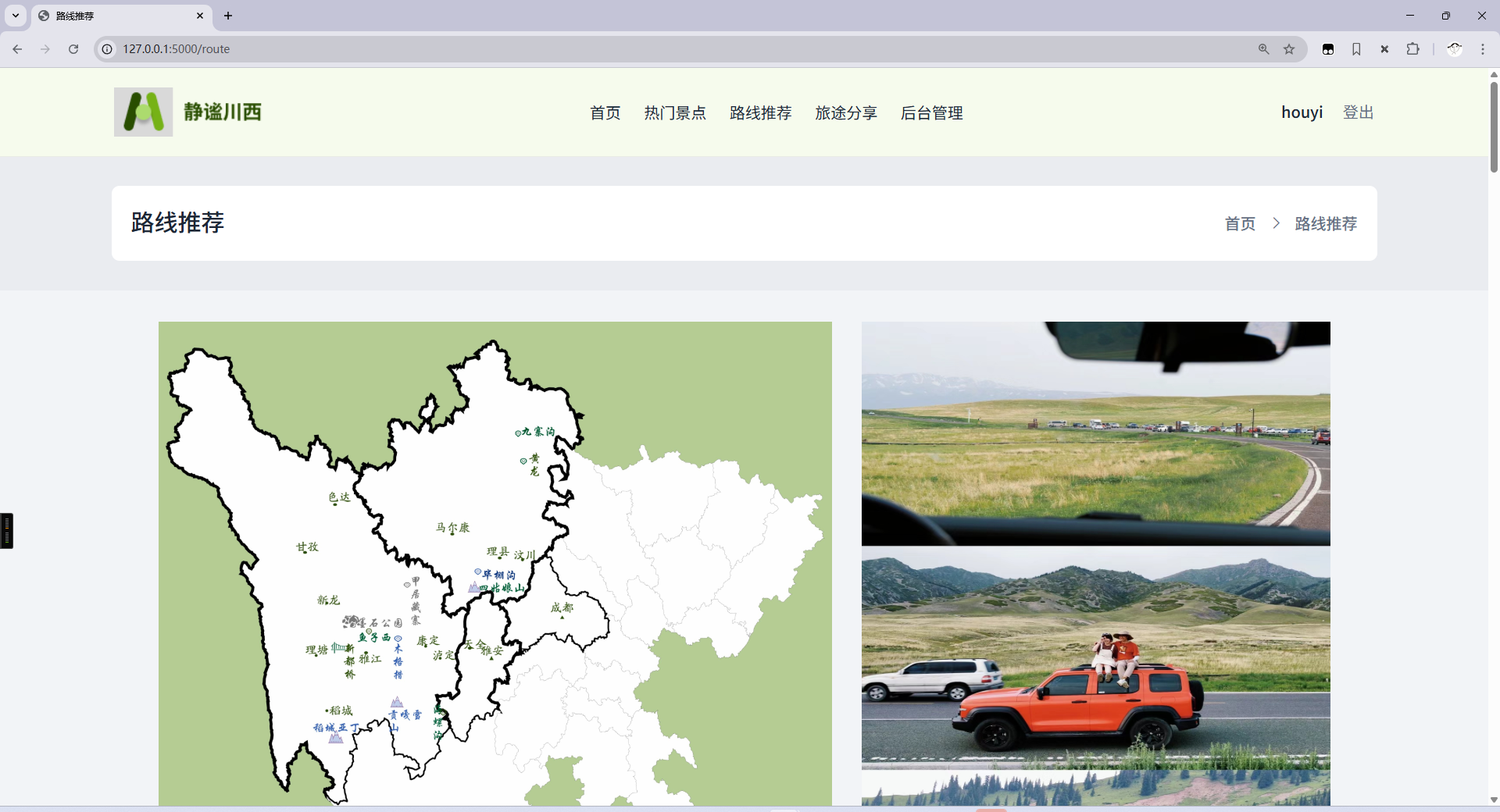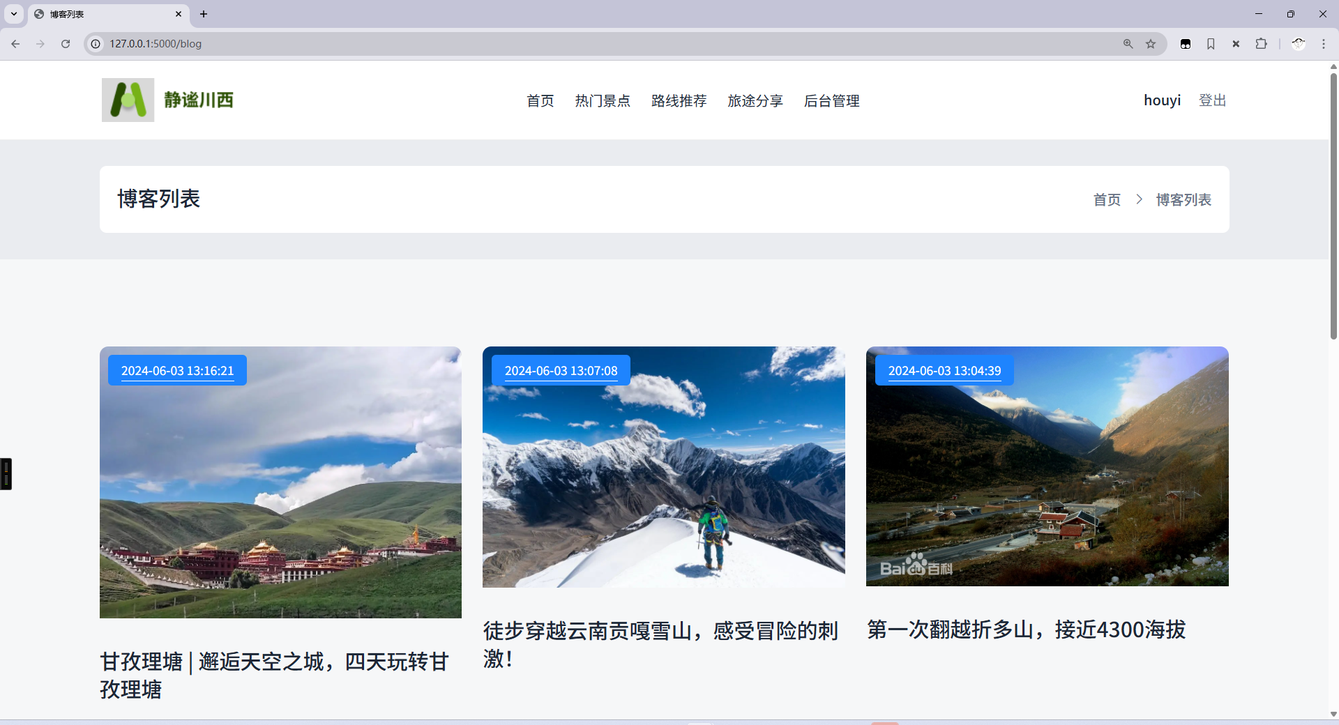 川西文旅网站是一个基于Python Flask框架开发的旅游博客平台,专注于展示川西地区的自然风光与人文特色。网站提供详细的景点介绍、推荐旅游路线及实用的旅行指南,涵盖交通、住宿和美食等信息。用户可注册账号、浏览内容、发表评论,管理员拥有后台管理权限。系统采用MySQL数据库,支持用户交互与内容管理,界面简洁友好,适合旅游爱好者获取灵感和规划行程。通过该平台,用户可以全面了解川西,提升旅行体验。