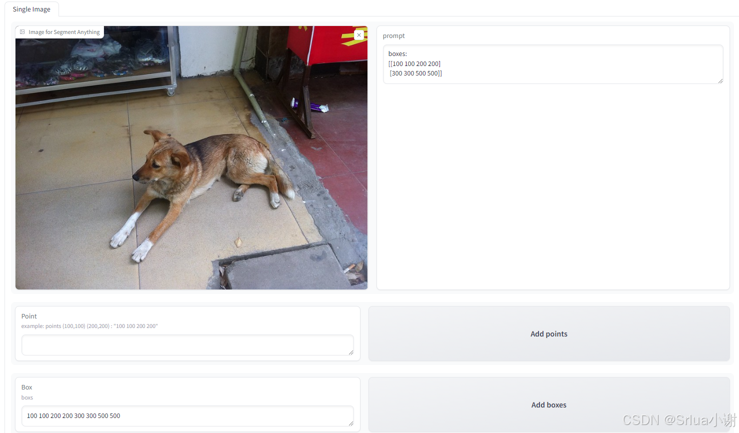 在 Box 一栏输入方框左上角的横纵坐标与右下角的横纵坐标。方框(100,100,200,200)和(300,300,500,500)就输入为"100 100 200 200 300 300 500 500 "点击右侧的 Add 将方框添加进 prompt 中。点击 Run 运行,现在不支持点和方框的混合输出。