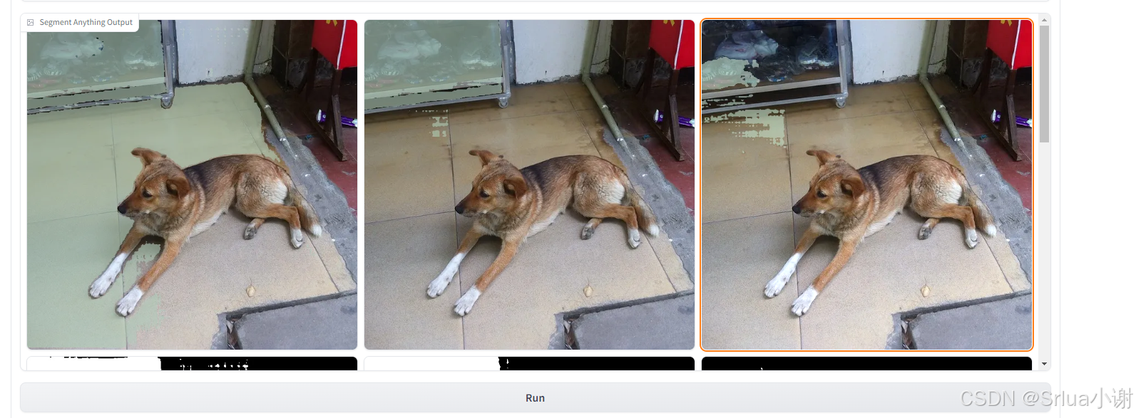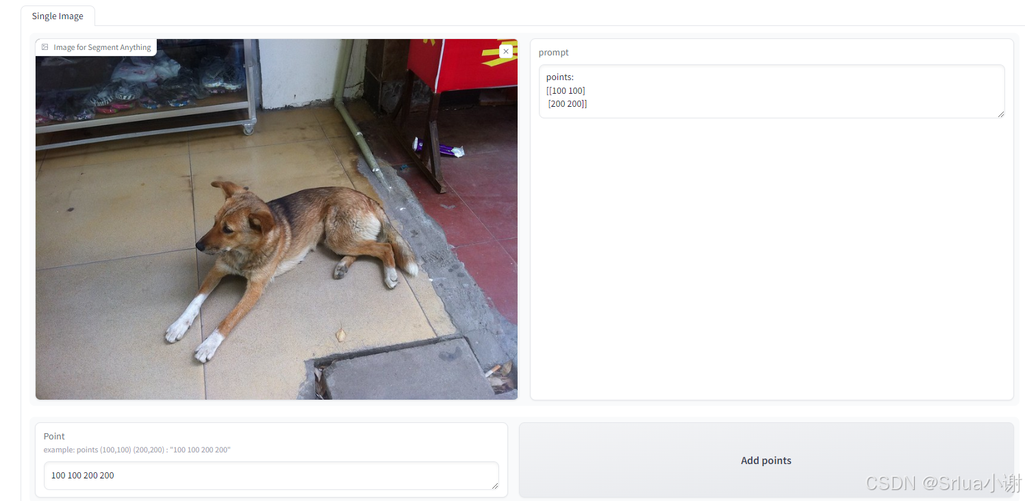 在 Point 一栏输入点的横纵坐标,SAM 就可以去识别点所标记的物体。支持多个点输入,例如(100,150)(250,300)就输入 “100 150 250 300” 即可。点击右侧的 Add 将点添加进 prompt 中。点击 Preview 可以预览点所在的位置。没有任何输入时点击预览可以查看图片的坐标轴。点击底部的 Run 即可根据输入的 prompt 分割图像,分给结果展示在下方。