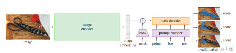 模型设计了两种 prompt:稀疏(points,boxes,text)、密集(masks)。点和框使用位置编码表示,与每种 prompt 的 learned embedding 相加。而文本使用来自 CLIP 的现成文本 encoder。密集型提示使用卷积进行 embedded, 与图像 embedding 相加。