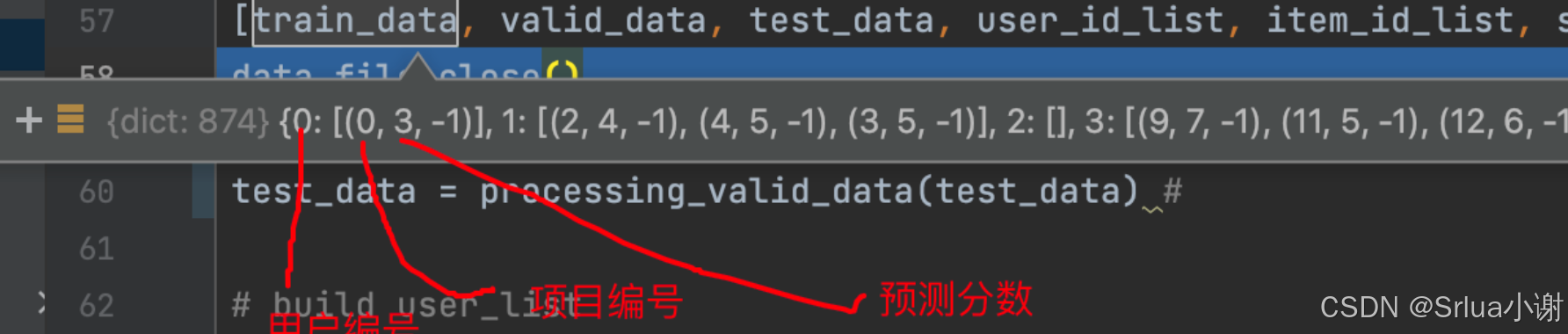 论文一共使用了ciao,epinions,filmtrust三个数据集。filmtrust数据集中有以下几个字段。train_data,valid_data,test_data,user_id_list,item_id_list,social。其中train_data,valid_data,test_data三者是含有874个元素的字典。其中每个字典的键是用户的id,每一个键对应一个三元组,三元组第一位表示item编号,第二位表示user对item的rate分数。第三位没啥用。