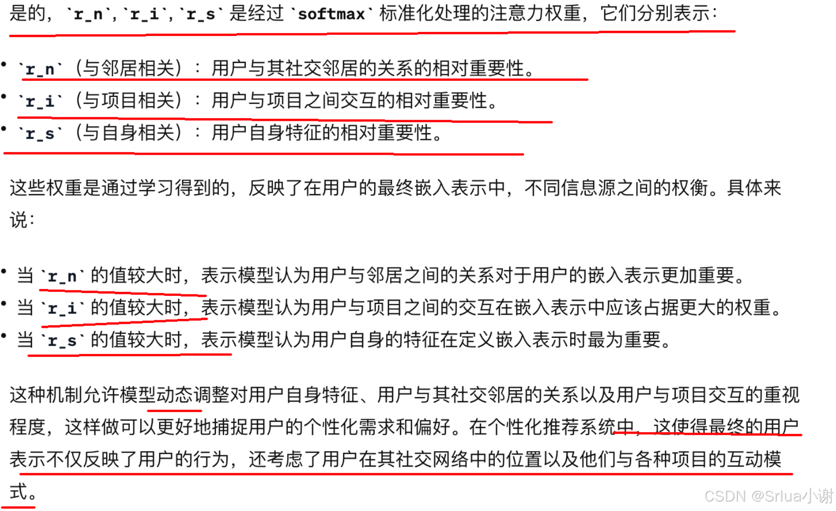 这里的torch.matmul()执行向量的点积计算出来的e_n,e_i,e_s。这是哪个值分别表示了用户-邻居,用户-项目,用户-自身三种关系的重要程度。