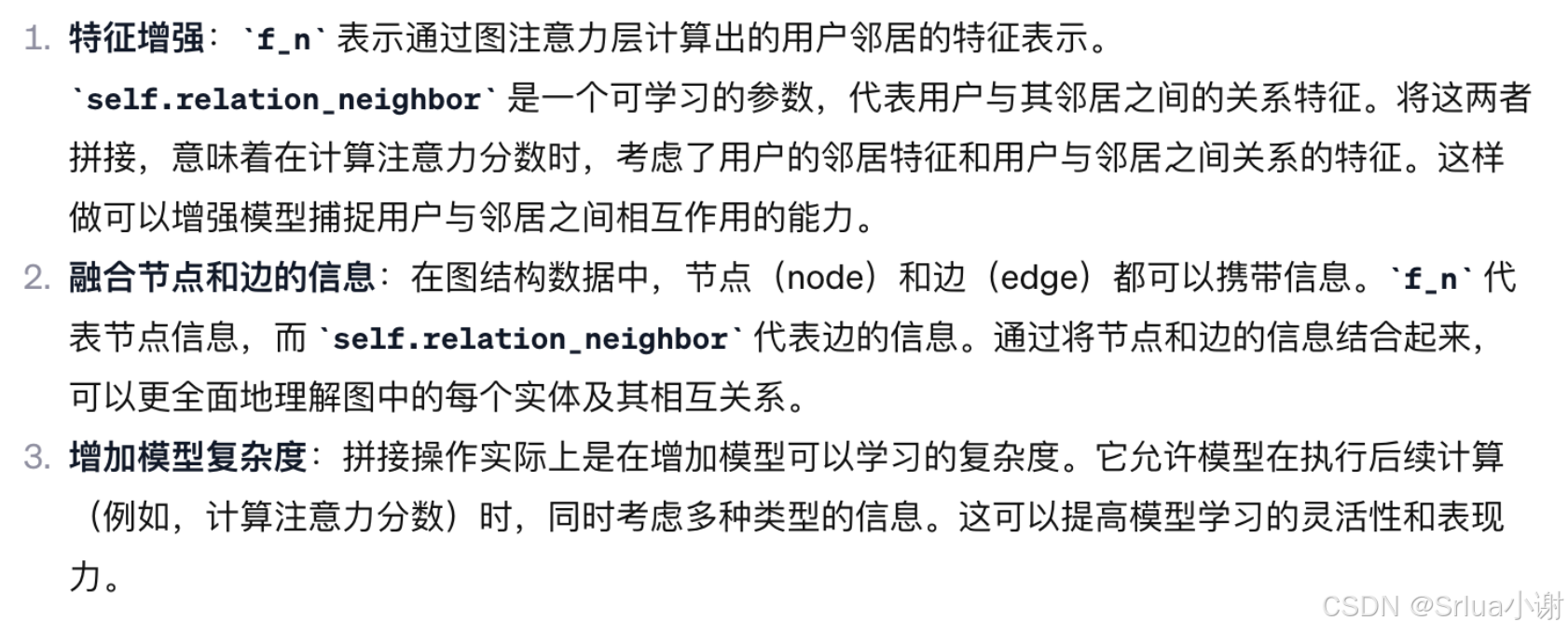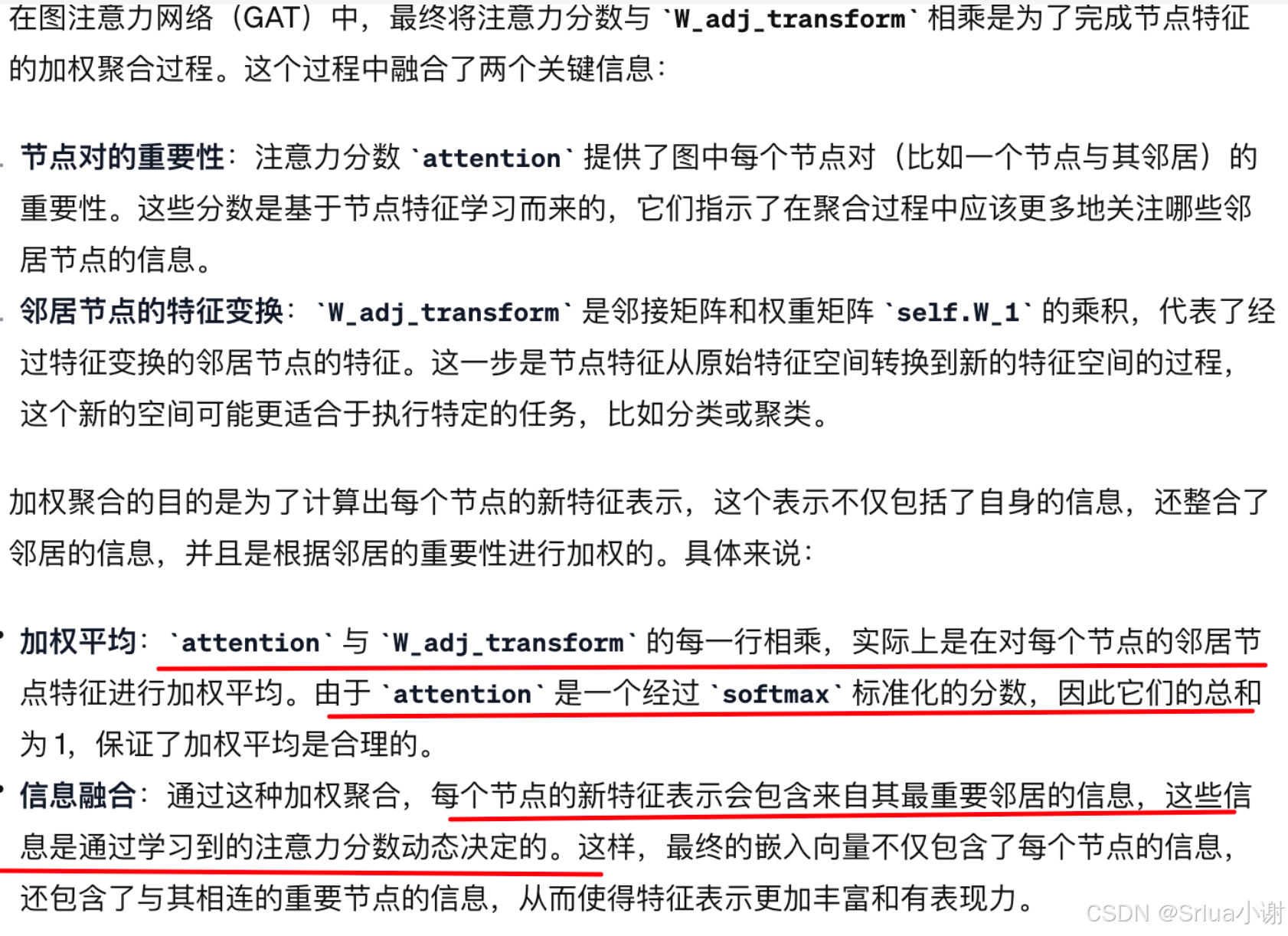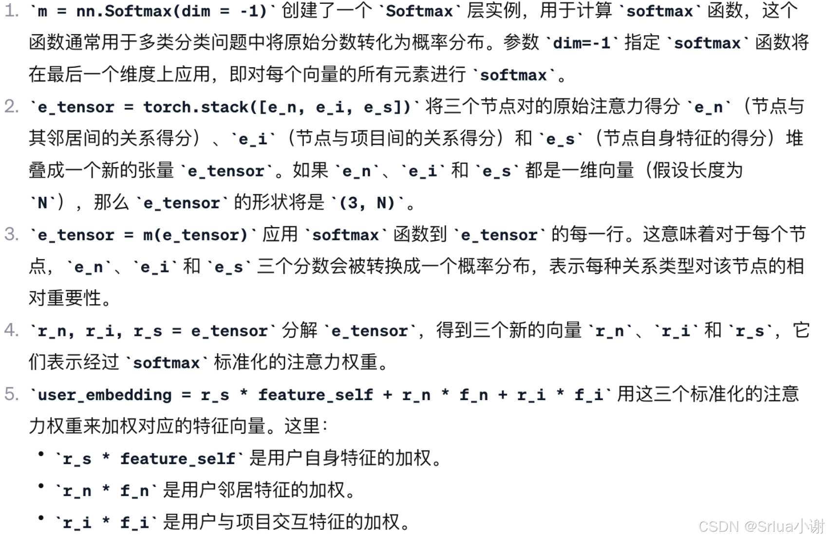 这里W_h.repeat是为了让W_h按照行多复制几遍,让每一行W_h和W_adj能按行横向拼接起来,横向拼接起来这个向量对可以代表一个user-user或者user-item对。接着下面attention代码可以对每一个向量对分配不同的权重,最终attention对的向量形式应该是(m*1)其中m是有多少个这样的向量对。然后使用非线性激活函数self.leakyrelu非线性激活函数处理这些注意力分数并帮助稳定梯度下降过程。接下来,使用 softmax 函数对这些分数进行标准化,确保所有注意力系数加起来等于 1。这样,每个分数就变成了一个概率值,代表相应节点对的相对重要性。最后将注意力分数和W_adj_transform相乘来对邻居或者项目的特征向量进行加权得到一个新的特征向量。
