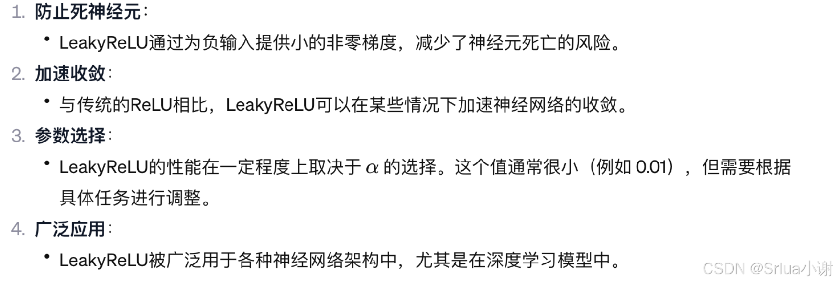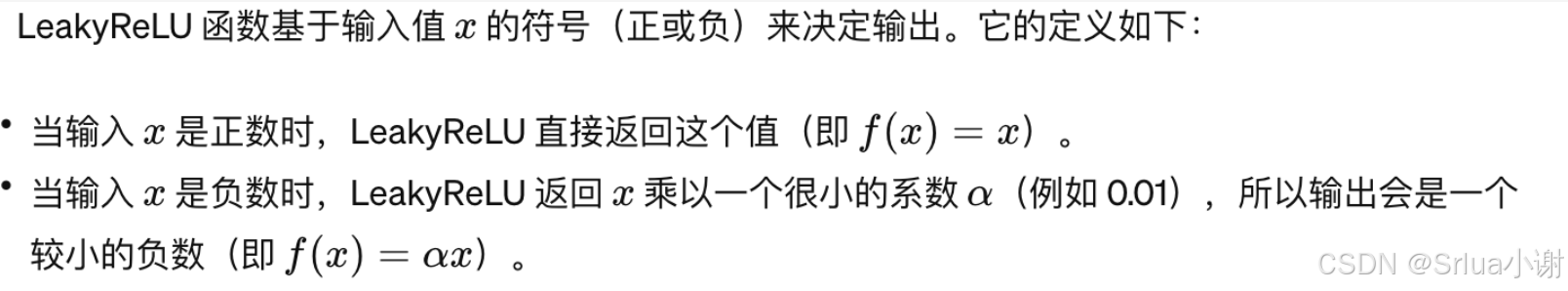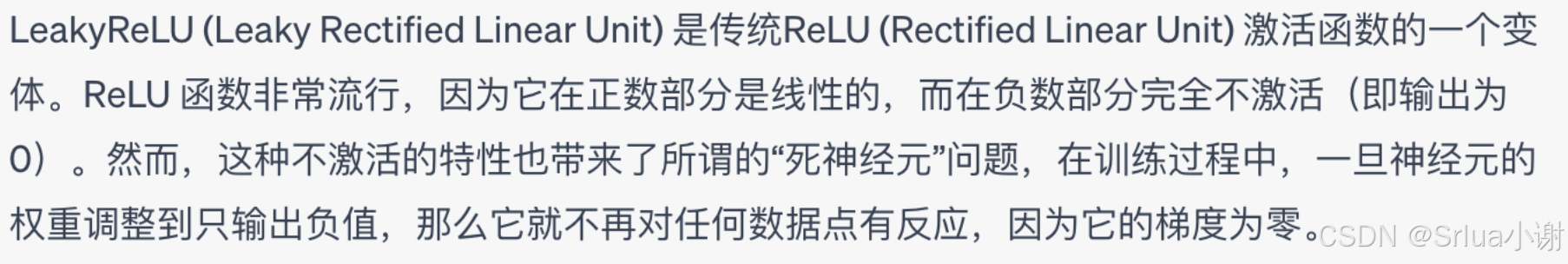 LeakyReLU(Leaky Rectified Linear Unit)是ReLU(Rectified Linear Unit)激活函数的一个变种,用于解决ReLU激活函数中的所谓“死神经元”问题。以下是LeakyReLU的主要特点和工作原理。