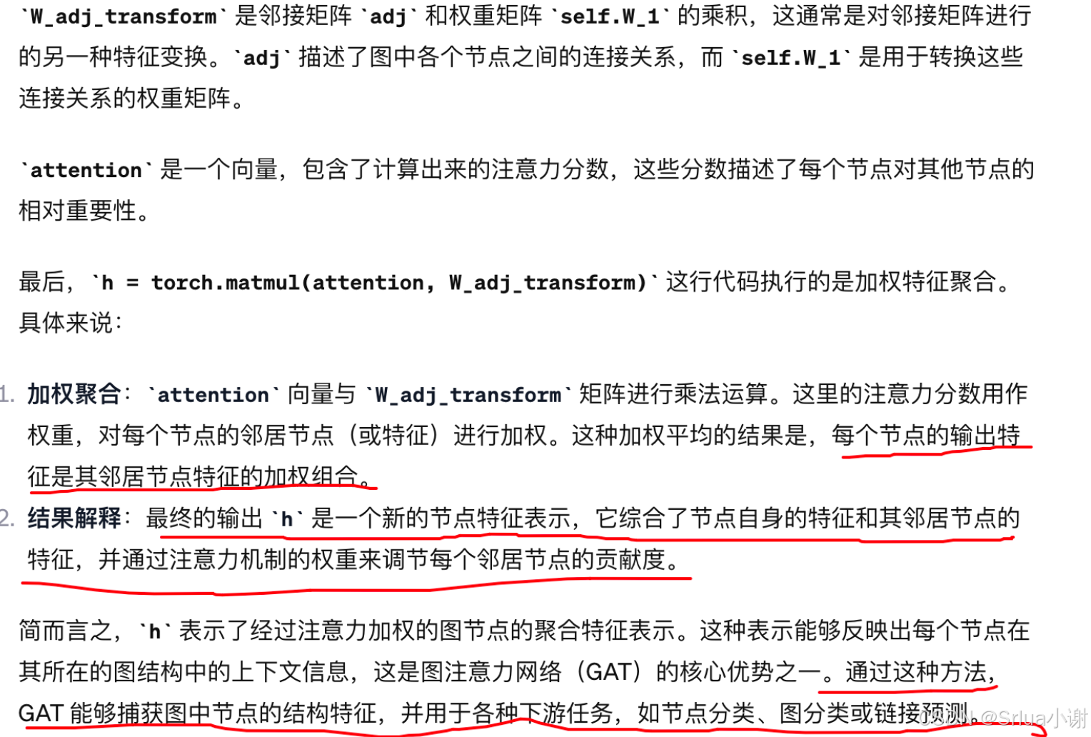 将邻接矩阵与权重 W1W1 相乘得到新的节点表示,然后通过注意力权重与这个表示相乘,得到最终的节点表示。