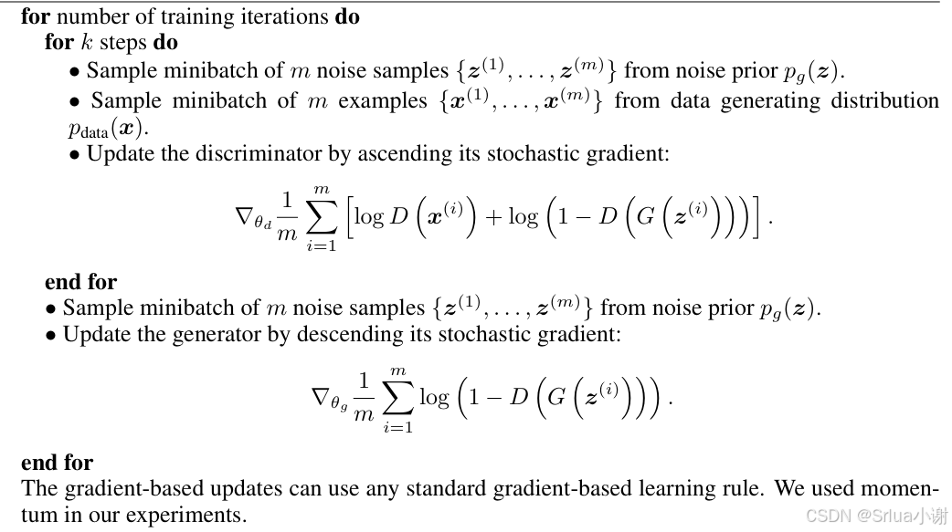 minGmaxDV(G,D)=Ex∼pdata(x)[logD(x)]+Ez∼pz(z)[log(1−D(G(z)))]GminDmaxV(G,D)=Ex∼pdata(x)[logD(x)]+Ez∼pz(z)[log(1−D(G(z)))]