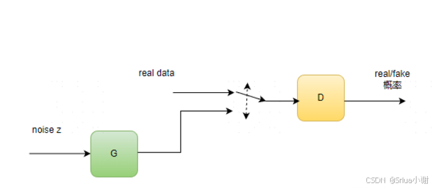 放一张GAN的结构,如下:我们有两个网络,生成网络G和判别网络D。生成网络接收一个(符合简单分布如高斯分布或者均匀分布的)随机噪声输入,通过这个噪声输出图片,记做G(z)。判别网络的输入是x,x代表一张图片,输出D(x)代表x为真实图片的概率。最终的目的式能够生成一个以假乱真的图片,使D无法判别真假,D存在的意义是不断去督促G生成的质量