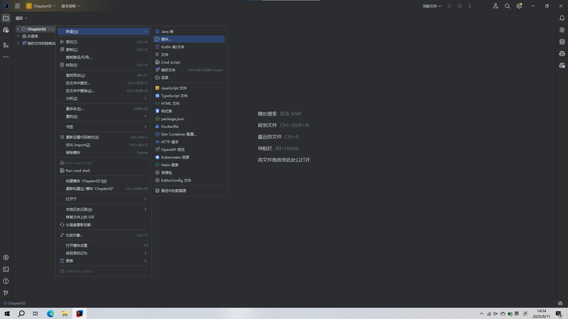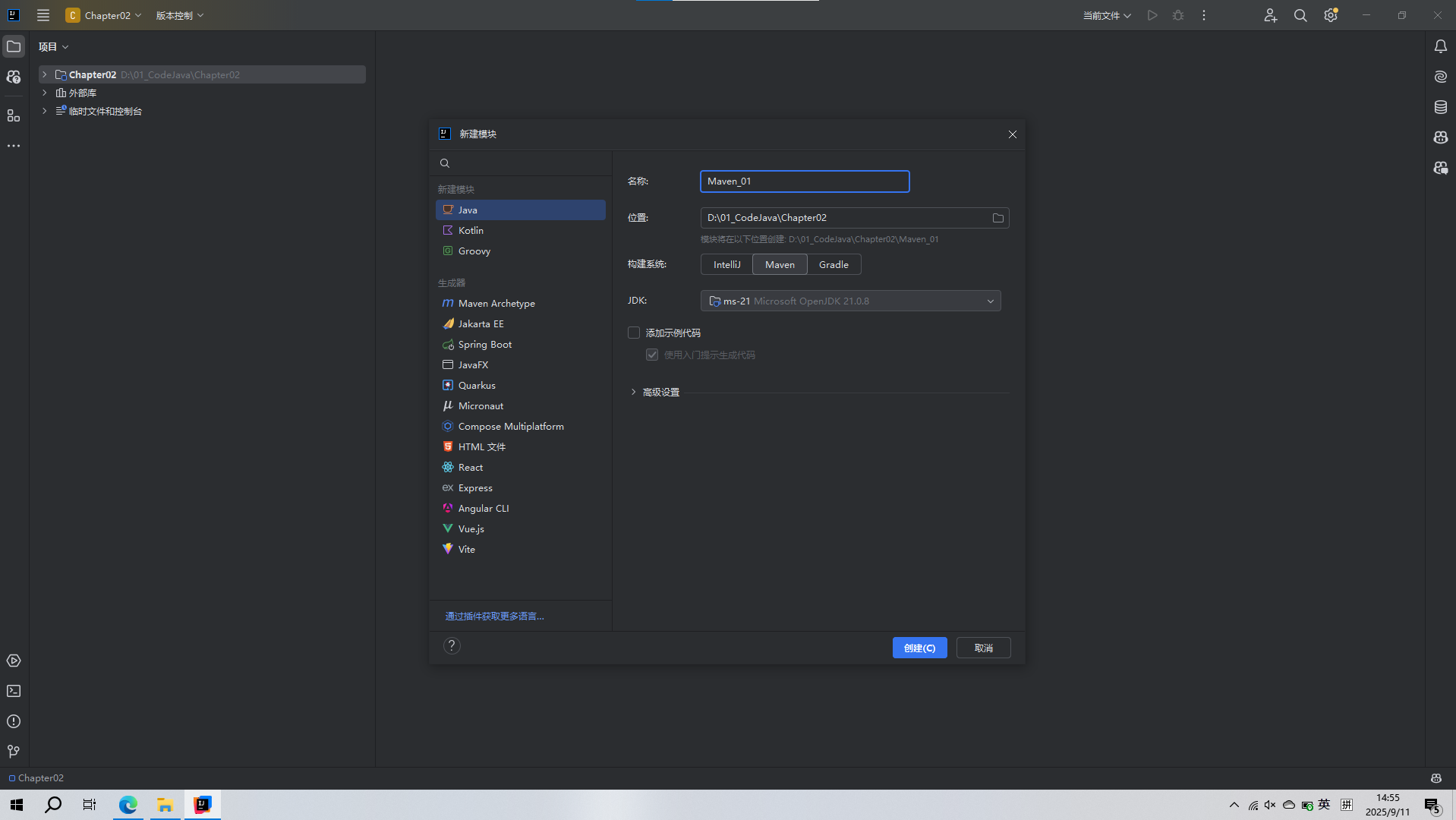右击项目,新建,模块。输入名称,选择位置,构建系统选择Maven,创建。