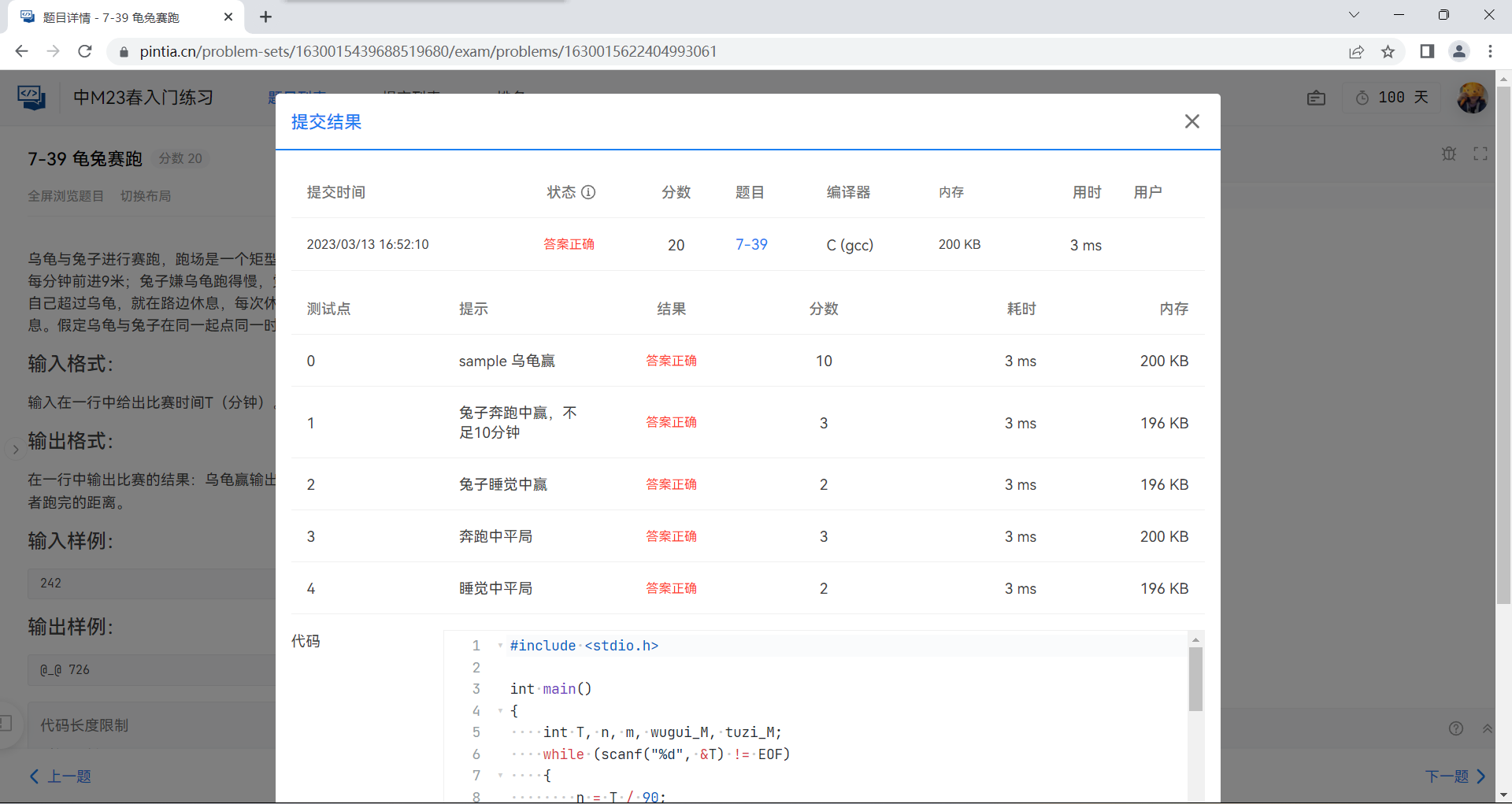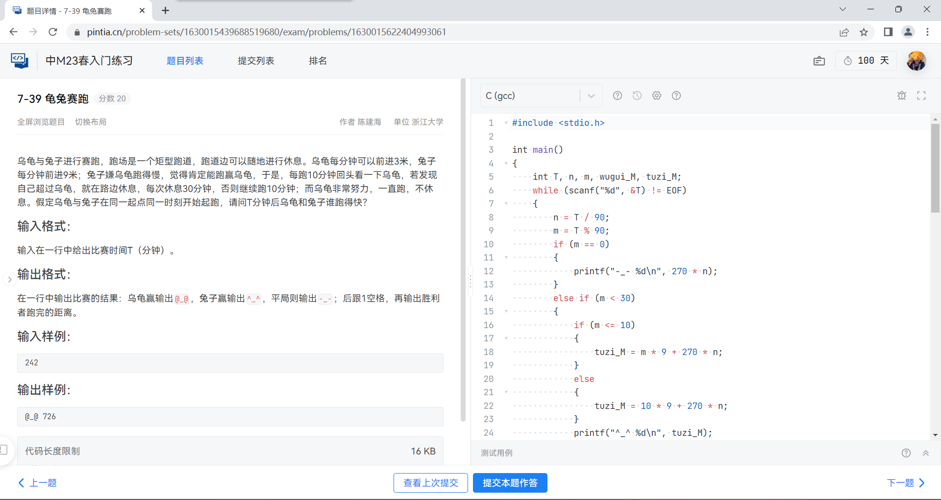 在一行中输出比赛的结果:乌龟赢输出@_@,兔子赢输出^_^,平局则输出-_-;后跟1空格,再输出胜利者跑完的距离。