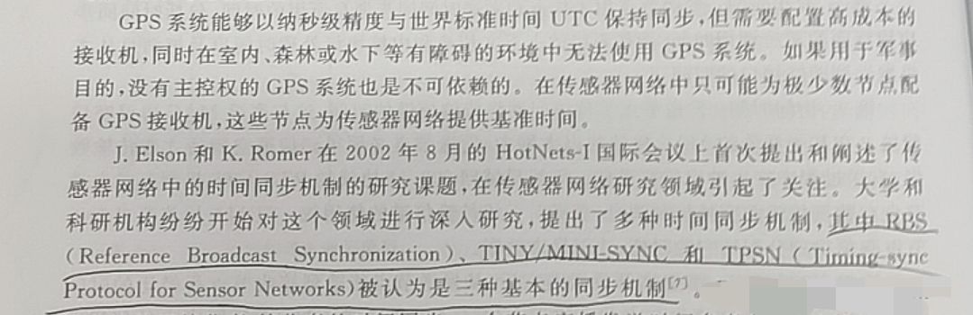 参考广播同步(RBS)机制利用无线数据链路层的广播信道的特性,一个节点发送广播消息,多个(至少两个)接收到广播消息的一组节点相互比较各自接收时间的本地时刻(交换),实现它们之间的时间同步(是它们之间的,不是它们与标准时间的同步)。