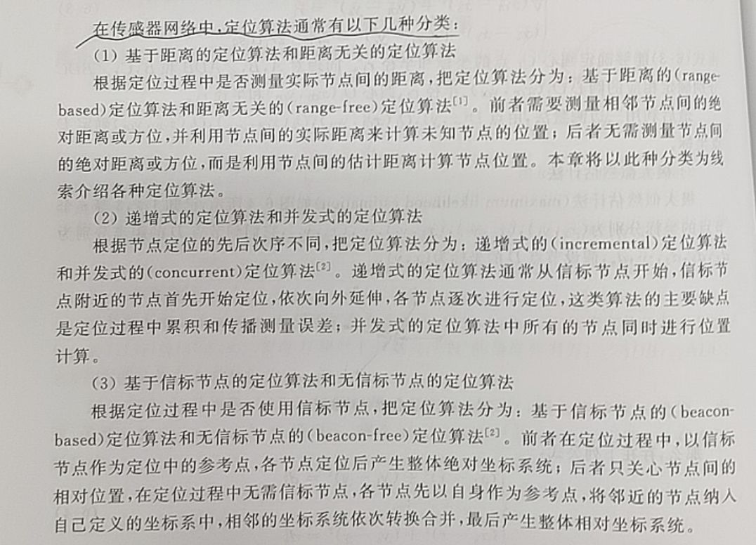 只记一些概念。都是在 2005 年的《无线传感网络》一书中摘取,基本概念可以了解,但具体方法在用的时候还需要再查阅最新的综述文献和书籍,再看新方法。这里的无线传感网络,即在一定区域内多节点分布式的分布且通过无线通讯方式而组成传感网络的范畴。
