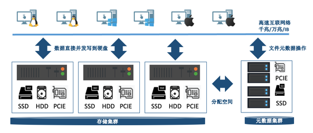 StarGFS并行文件系统包含三种系统模块:可用于访问文件系统的文件系统客户端、提供文件I/O服务的智能存储节点和管理文件系统中的名称和目录的元数据节点。下图显示了一个具有StarGFS文件系统的集群。