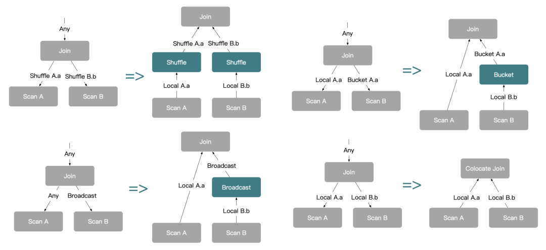 当然,如果继续引入 Colocate Join 和 Bucket Shuffle Join,StarRocks 还可以推导出下面这样一些 Plan: