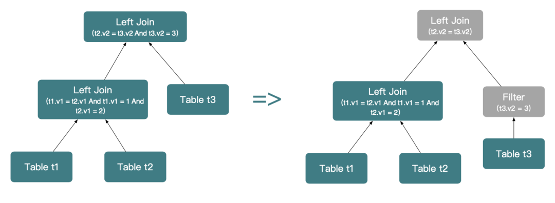 第一步,下推 t1 Left Join t2 Left Join t3 上可以 bind 到右表的连接谓词 (t3.v2 = 3),此时无法将 Left Outer Join 转换为 Inner Join。
