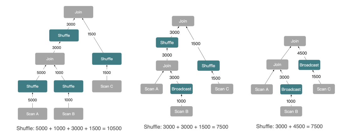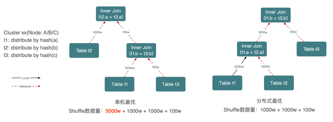 在分布式系统中,会通过 Re-Shuffle 或者广播数据的方式,将需要的数据发送到目的端参与计算,分布式数据库中 Join 也是如此。但这也带来了另外一个问题,一个单机数据库上最优的执行计划,因为没有考虑数据的分布 & 网络传输的开销,放在分布式数据库上未必是最优的执行计划。分布式数据库在规划 Join 的执行计划和执行方式时,需要考虑数据的分布和网络成本。