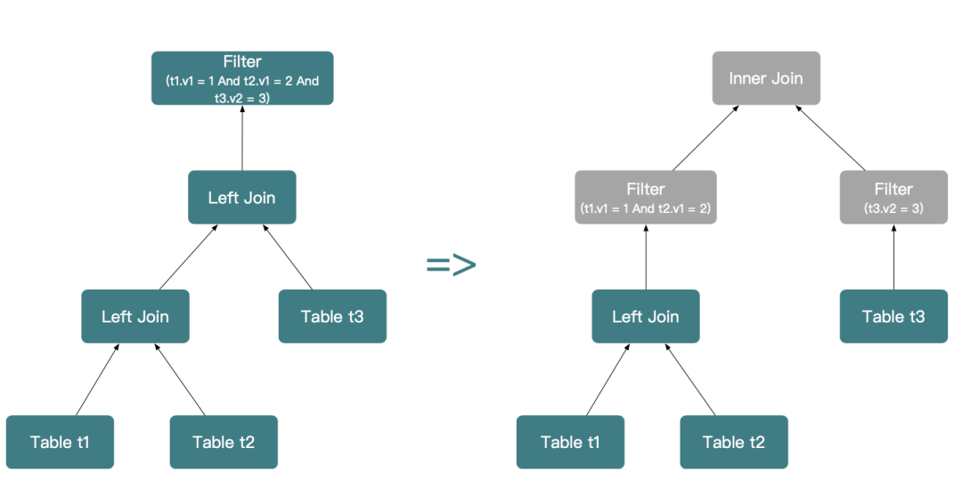 第一步,分别下推 (t1.v1 = 1 And t2.v1 = 2) 和 (t3.v2 = 3),由于满足类型转换规则(t1 Left Outer Join t2) Left Outer Join t3 转换为 (t1 Left Outer Join t2) Inner Join t3。