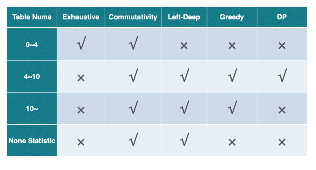 基于上述耗时的结论,StarRocks 对各个算法的执行做了简单的限制。当在 4 表以内的 Join Reorder 使用穷举算法;4~10 表时会分别使用左深、贪心、动态规划算法产生 1 个、10 个、1 个计划,并且在此基础上会使用 Join 交换律探索更多的 Plan;当 10 表以上时,StarRocks 就只使用贪心和左深产生的 11个 Plan 为基础进行 Reorder;另外,在 StarRocks 没有统计信息时,基于 Cost 的贪心和动规都无法很好地工作,所以只会使用左深产生的 1 个 Plan 为基础 Reorder。