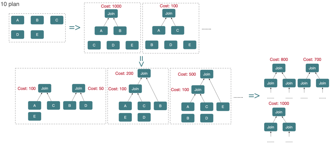 StarRocks 在贪心算法上主要参考多序列贪心算法,其次做了一个小改进,就是对于贪心算法每层产生的结果,StarRocks 都会保留 10 个最优解(可能不是全局最优),以此往后迭代,最终计算出 10 个贪心最优的 Plan。