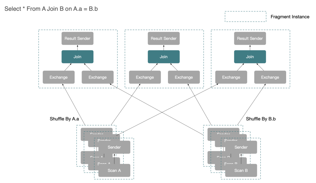 首先,StarRocks 的执行框架是一个 MPP 的并行执行架构,整体架构如图所示,以一个简单的 Join SQL 为例,StarRocks 执行 A Join B 的流程如下: