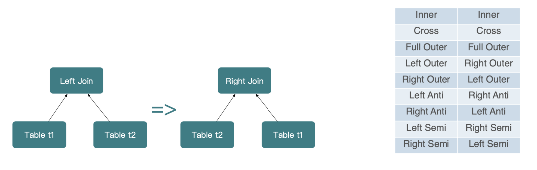 A Join B 转为 B Join A,转换过程中需要注意 Join 类型的变化,比如 Left Outer Join 交换后变为 Right Outer Join。
