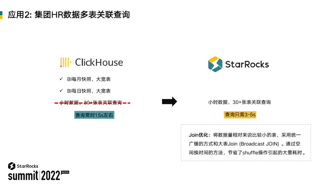 第二个场景是集团 HR 的服务,这里主要是验证 StarRocks 自助分析的过程中多表关联的查询性能。