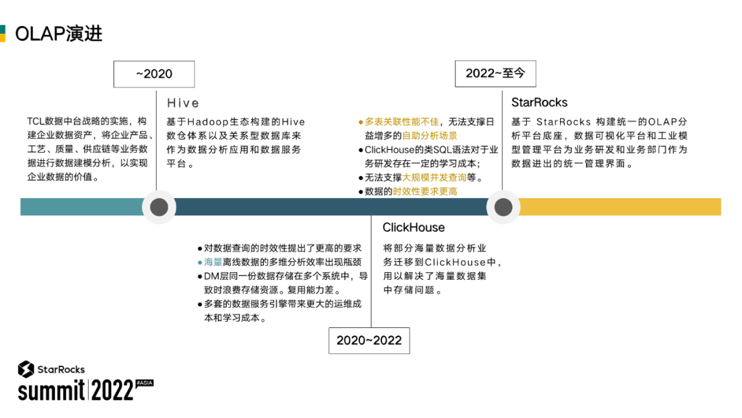 本文将围绕背景、OLAP 建设历程、StarRocks 典型应用场景、未来规划等几点展开介绍 TCL 选择并应用 StarRocks 的最佳实践。