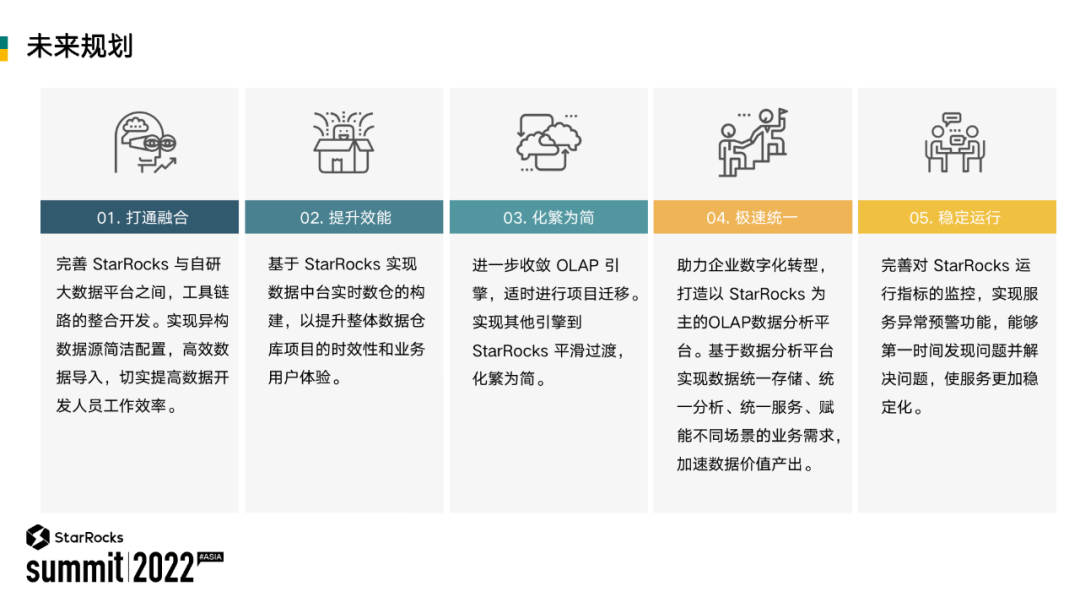 1. 打通融合:StarRocks 是我们今年新上线的 MPP 数据库,跟我们自研的大数平台存在很多整合的工作,我们会继续往下开展。
