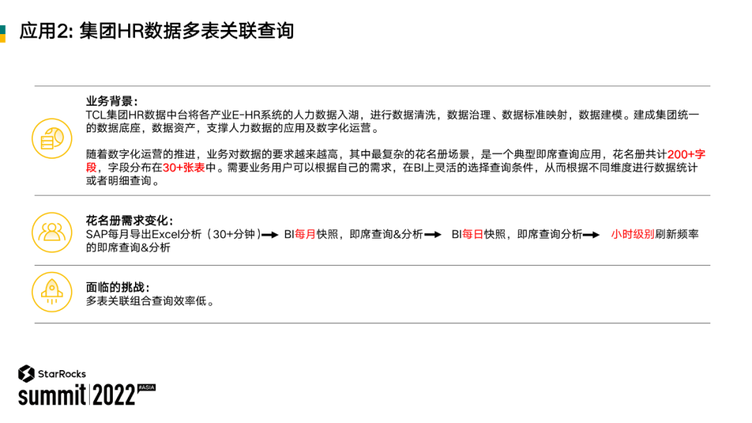 这里面会有个指标极端的场景,TCL 每年会收到政府的一些临时的报数要求,为了应付这种场景,我们会做一个花名册,花名册里面有 200 多个字段,字段会分布在 30 多张表里面。