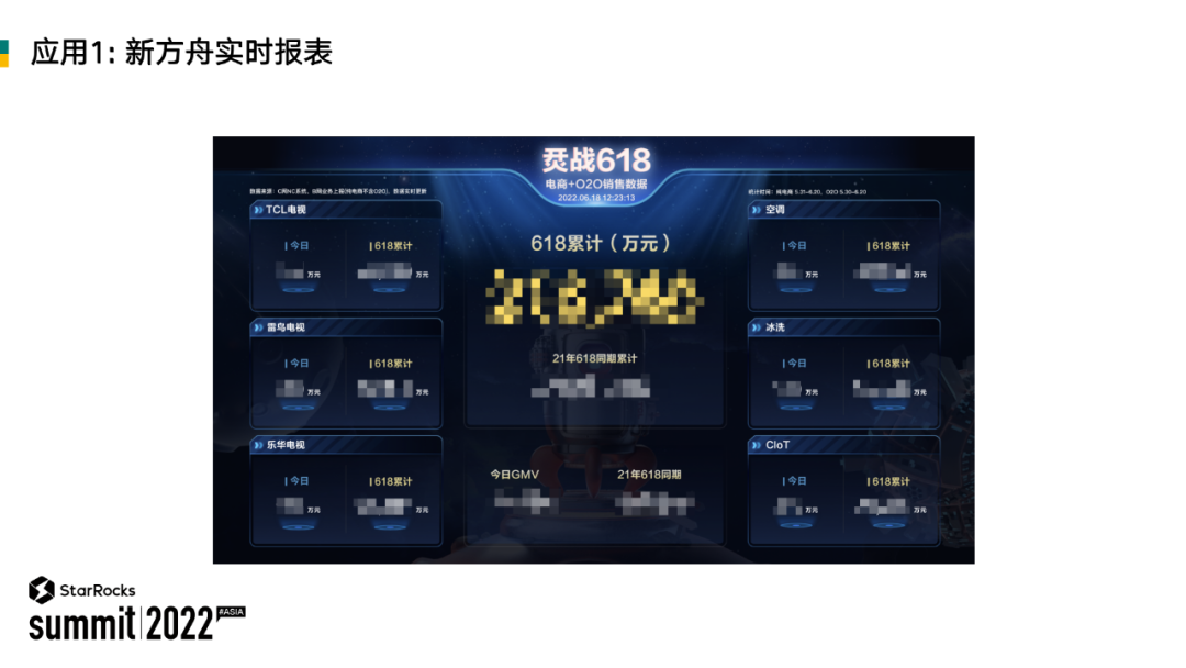 这是当时做的 618 的销售看板,通过新方舟场景的验证,StarRocks 能很好的支撑实时数仓以及实时报表分析的需求。