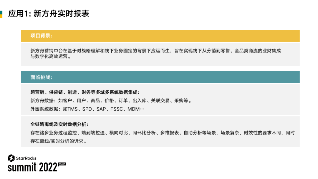 新方舟是我们今年刚上线的营销中台。基于营销,我们要做很多方面的数据的分析,这个场景要面临跨越营销、供应、制造等等多域的数据的集成分析,不同域的数据时效性,对分析的要求不一样。
