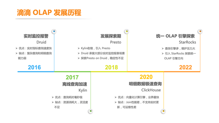 在 2020 年后引入当时业界广泛使用的 ClickHouse 引擎。ClickHouse 是一款开源 OLAP 的列存数据库, 号称比 MySQL 快 100-1000 倍,最大的特色是高性能的向量化执行引擎,单机性能强悍。通过 ClickHouse,支持了当时网约车、 顺风车、青桔单车、橙心优选等多个业务线运营看板、实时分析等场景。经过长时间的发展和迭代, ClickHouse 和 Druid 成为当时滴滴内部主要的 OLAP 引擎,也初步让 OLAP 产品在滴滴内部发展壮大。