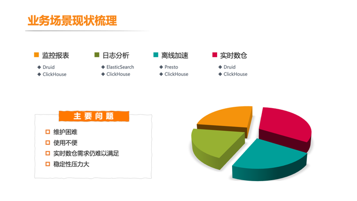 2. 使用不便:不同引擎特点不同,它们针对的场景比较单一,用户难以根据业务场景正确选择引擎。另外,对于 ClickHouse 从能用到用好难度很大,经常出现查询性能未达预期。