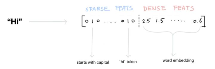 - 稀疏特征:通常由计数向量器生成,这些计数也可能表示子词。还有一个词汇语法增强器生成对实体识别有用的基于窗口的特征。当与spaCy相结合时,LecticalSyntacticFeaturizer 可以配置包括词性特征