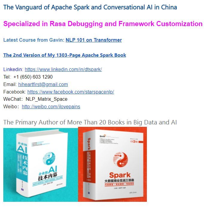作者参与Gavin大咖主编出版Spark系列图书5本,清华大学出版社最新出版2本新书《Spark大数据商业实战三部曲:内核解密|商业案例|性能调优》第二版、《企业级AI技术内幕:深度学习框架开发+机器学习案例实战+Alluxio解密》,累计原创博客1475篇,涵盖大数据、人工智能、智能对话机器人等内容,博客阅读量达217万次。
