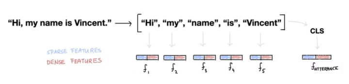 - 密集特征:由许多预先训练的嵌入词向量组成。通常来自SpacyFeatureizers或来自 huggingface及LanguageModelFeaturizers,应在管道中包含适当的标记器。