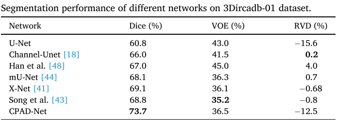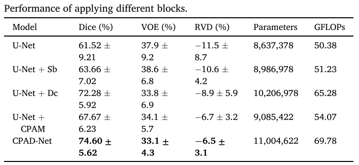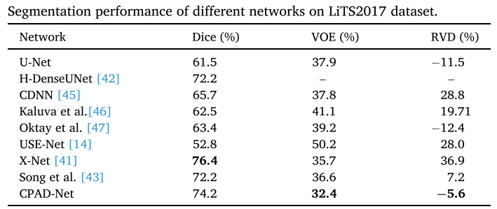 结论:本文设计了一种变异的U型结构,即CPAD-Net,用于肝脏肿瘤的分割。在跳跃连接处采用CPAM块以提取上下文高级和低级特征。上下文高级和低级特征在跳过连接处融合。通过CPAM块获得多尺度信息中最相关的信道和空间信息。这一信息大大提高了分割性能。Dc阻断有助于改善感受野,以便网络能够检测肿瘤的整体位置。Sb块改善了池化的缺陷并减少了详细信息的丢失。在三个数据集上验证了该网络的有效性和通用性,并取得了与现有方法相当的性能。