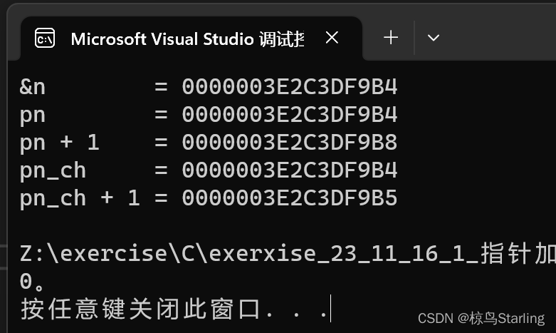 可以看到int*类型的指针变量加一时一次跳过4个字节,而char*一次跳过1个字节,这与其指向的数据类型的长度一致。