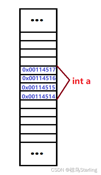 如果我们创建一个int类型的变量a,我们知道int类型每一个变量占用4个字节。又因为栈区内存每一个存储类型之内由低向高存储,我们可以画出如下示意图(里面的具体地址只是举个例子):