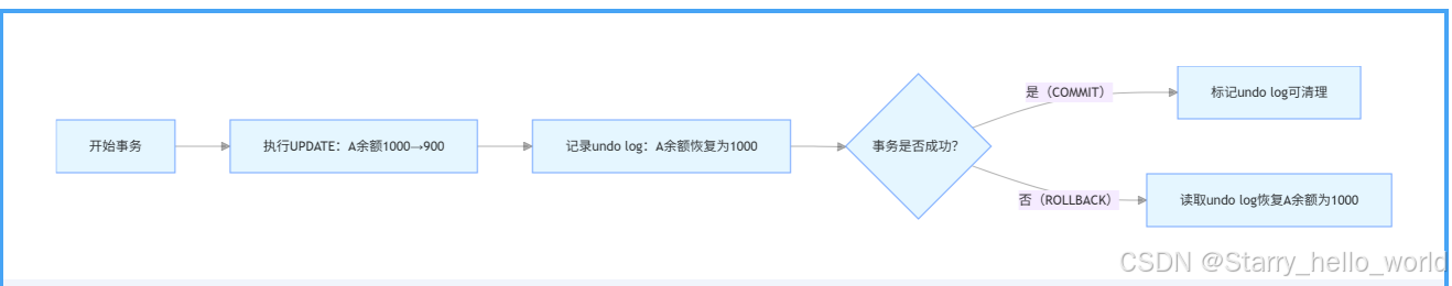 - 执行UPDATE account SET balance = 900 WHERE id=1(原余额 1000)时,undo log会记录:id=1的balance应恢复为1000;