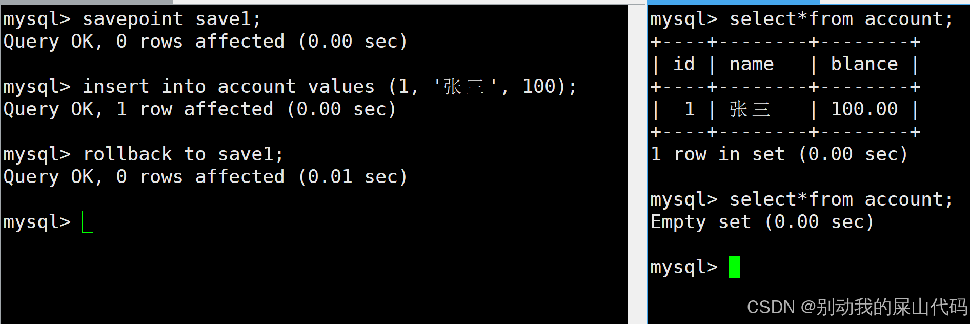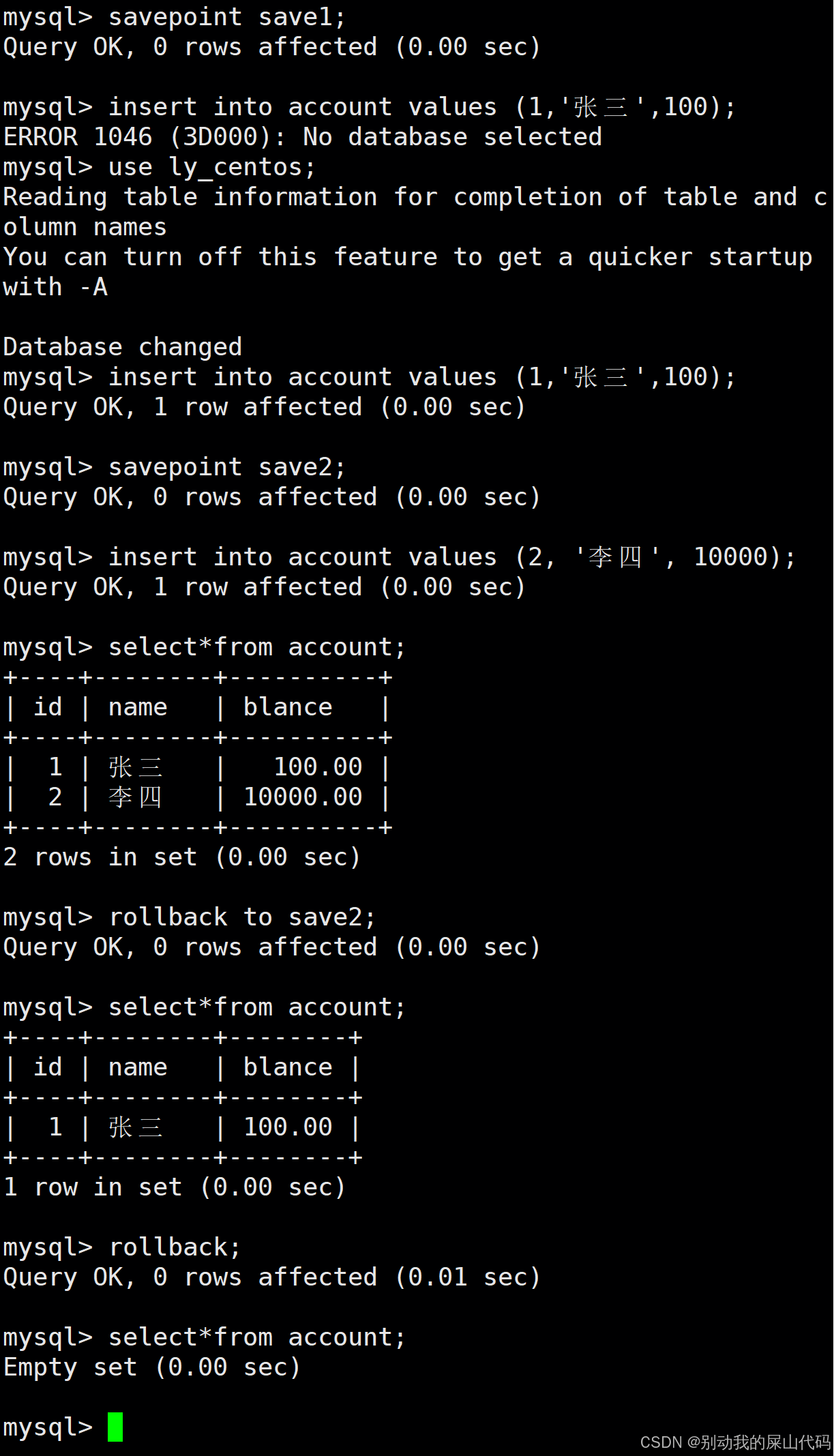 我们可以创建保存点save1和save2 同时我们可以回滚到任意一个保存点 当我们直接rollback不指定保存点时 它就会直接回滚到最开始