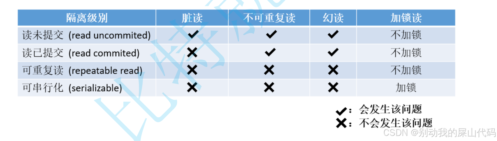 隔离级别如何实现:隔离,基本都是通过锁实现的,不同的隔离级别,锁的使用是不同的。常见有,表