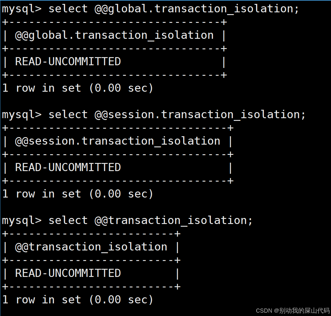 3. 查看当前会话事务隔离级别(简写形式) @@transaction_isolation 是 @@session.transaction_isolation 的简写,效果相同,也用于查询当前会话的事务隔离级别: