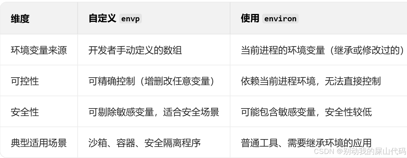 自定义 envp 是 “按需定制”,environ 是 “全盘继承”。