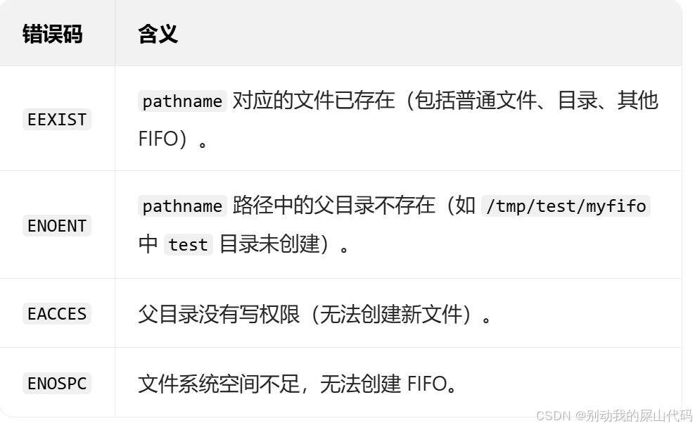 成功:返回 0,表示命名管道已在 pathname 指定路径创建成功;