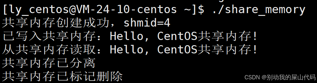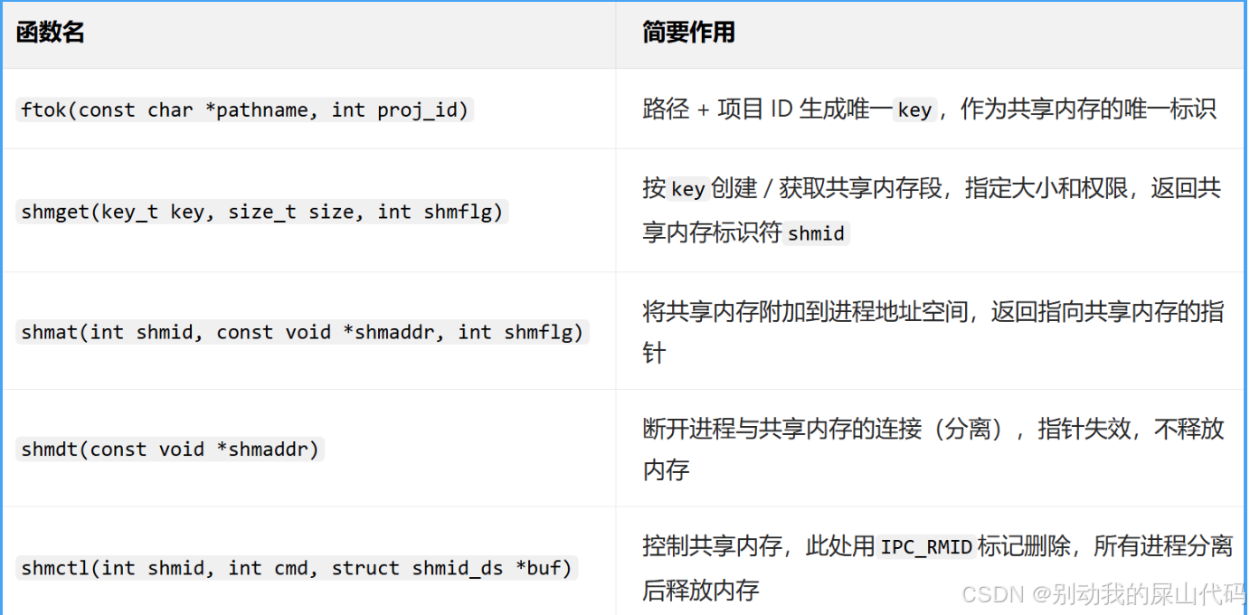 核心功能:断开进程与共享内存的地址映射,指针shmaddr失效;仅减少共享内存的 “附加计数”,不释放内核中的共享内存。