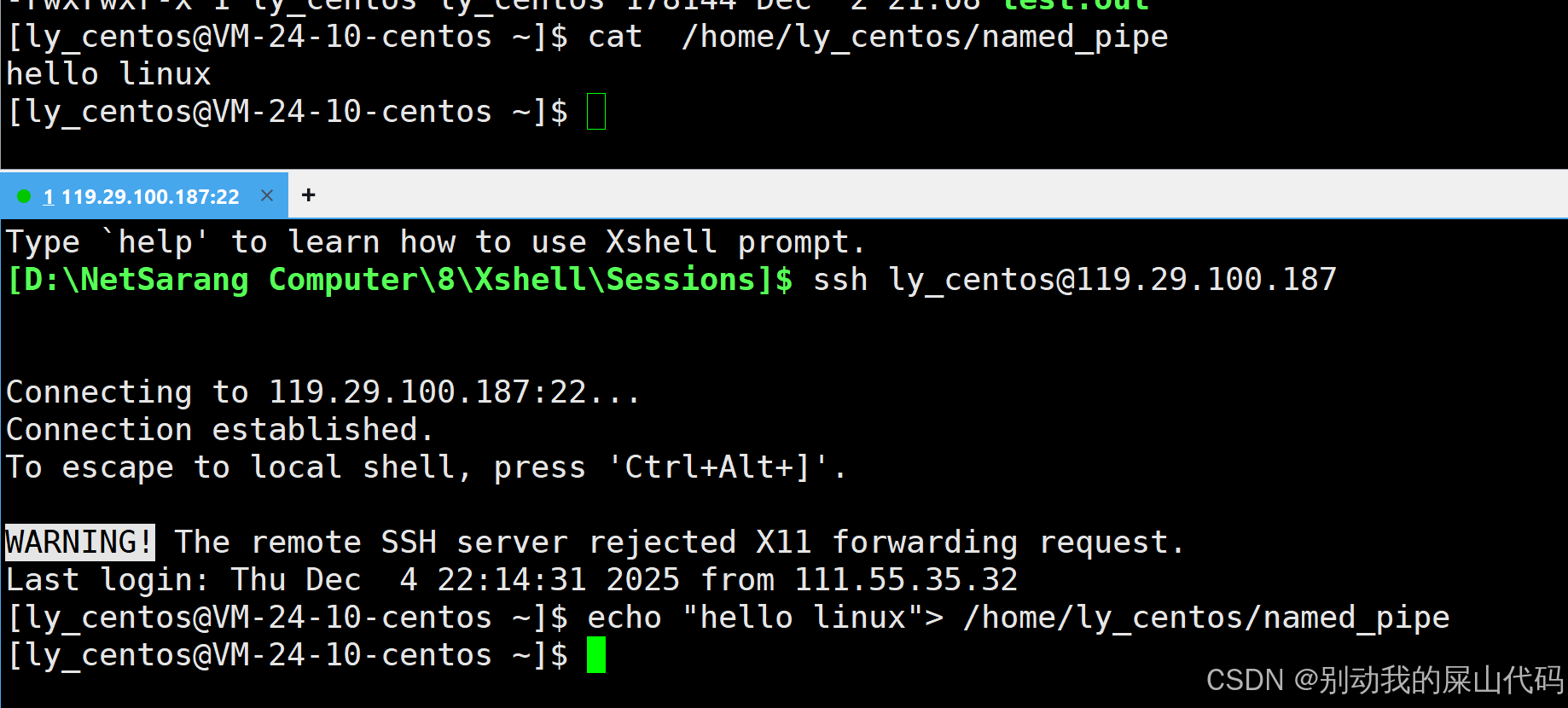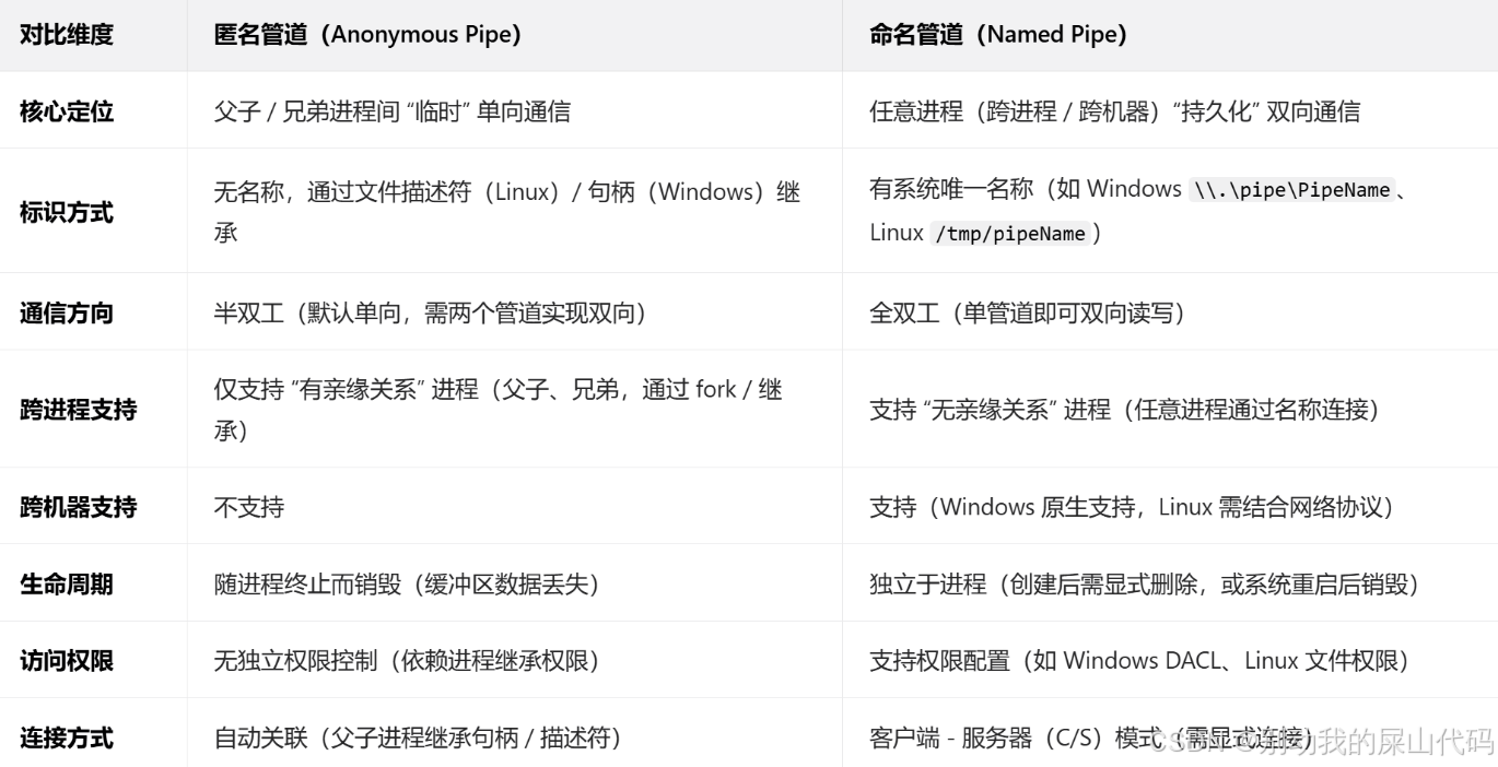 注意:管道是 半双工(Half-duplex)的 —— 同一时间只能单向传输数据(要么 “写→读”,要么 “读→写”,不能同时双向)。