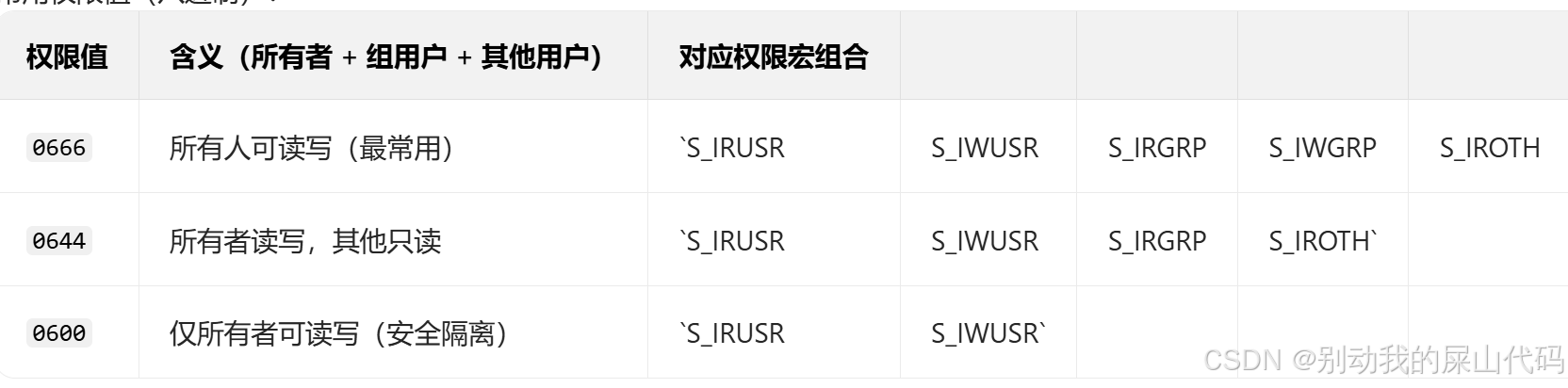 权限位(如0666= 读写)+ 控制标志(IPC_CREAT= 不存在则创建;IPC_EXCL+IPC_CREAT= 防重复创建)