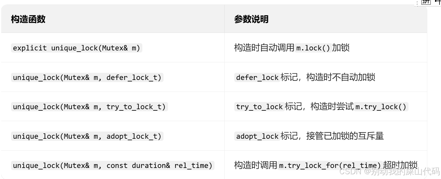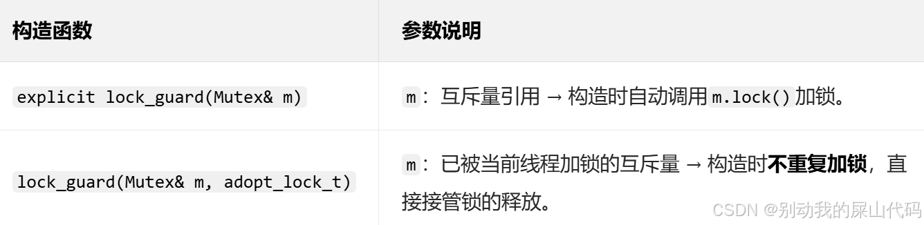 | 构造方式 | 必须在构造时绑定锁并加锁(或用adopt_lock表示已加锁) | 支持延迟加锁(用defer_lock参数,构造时不自动加锁,后续手动lock()) |